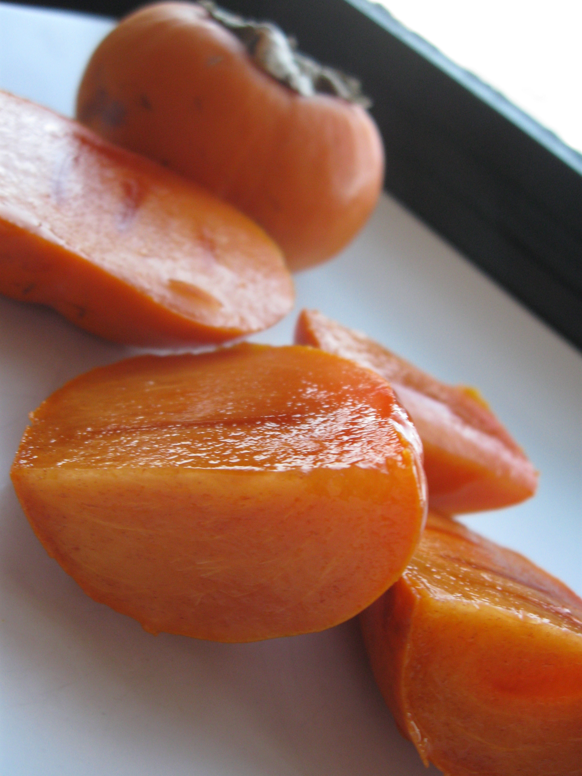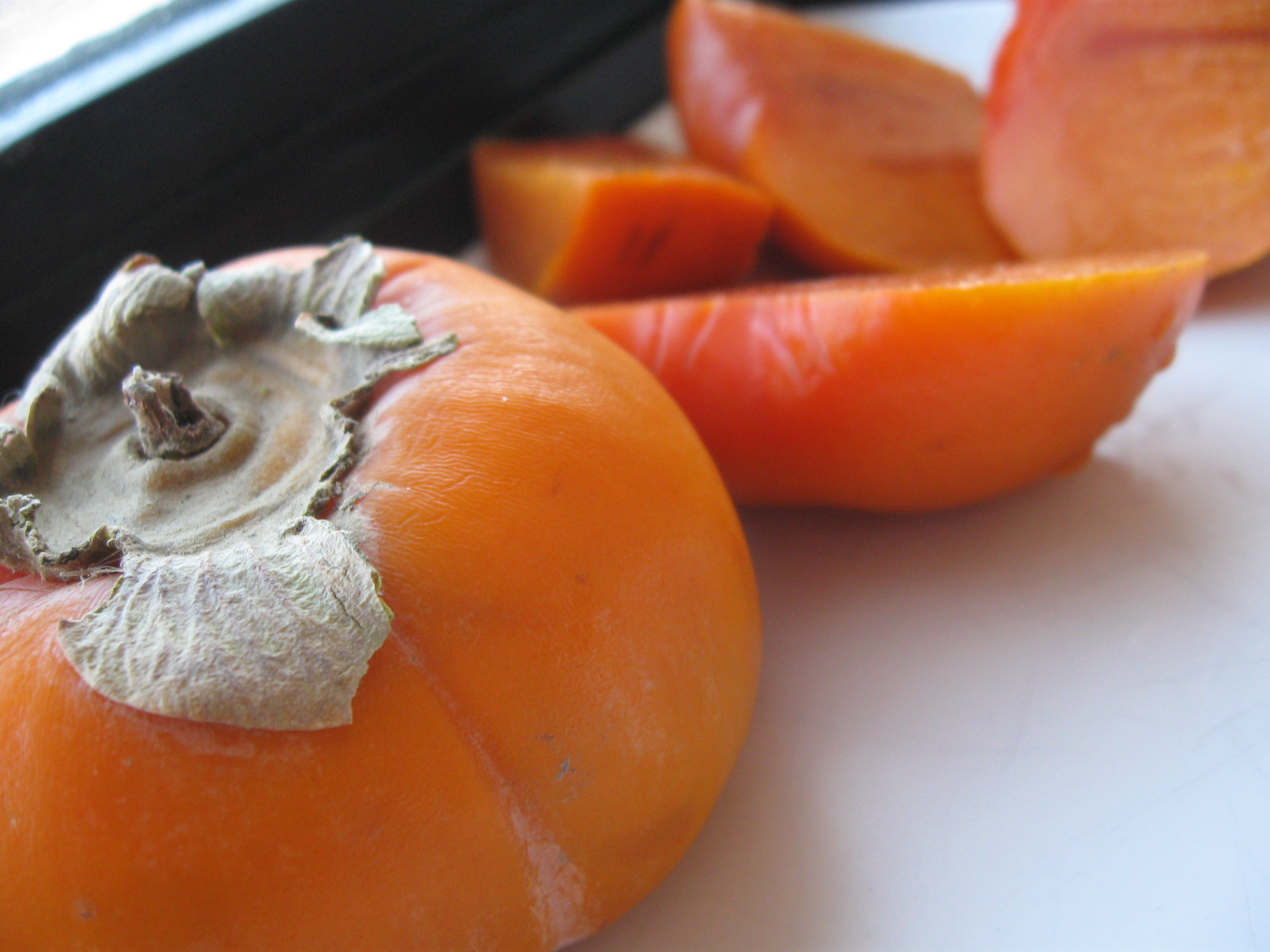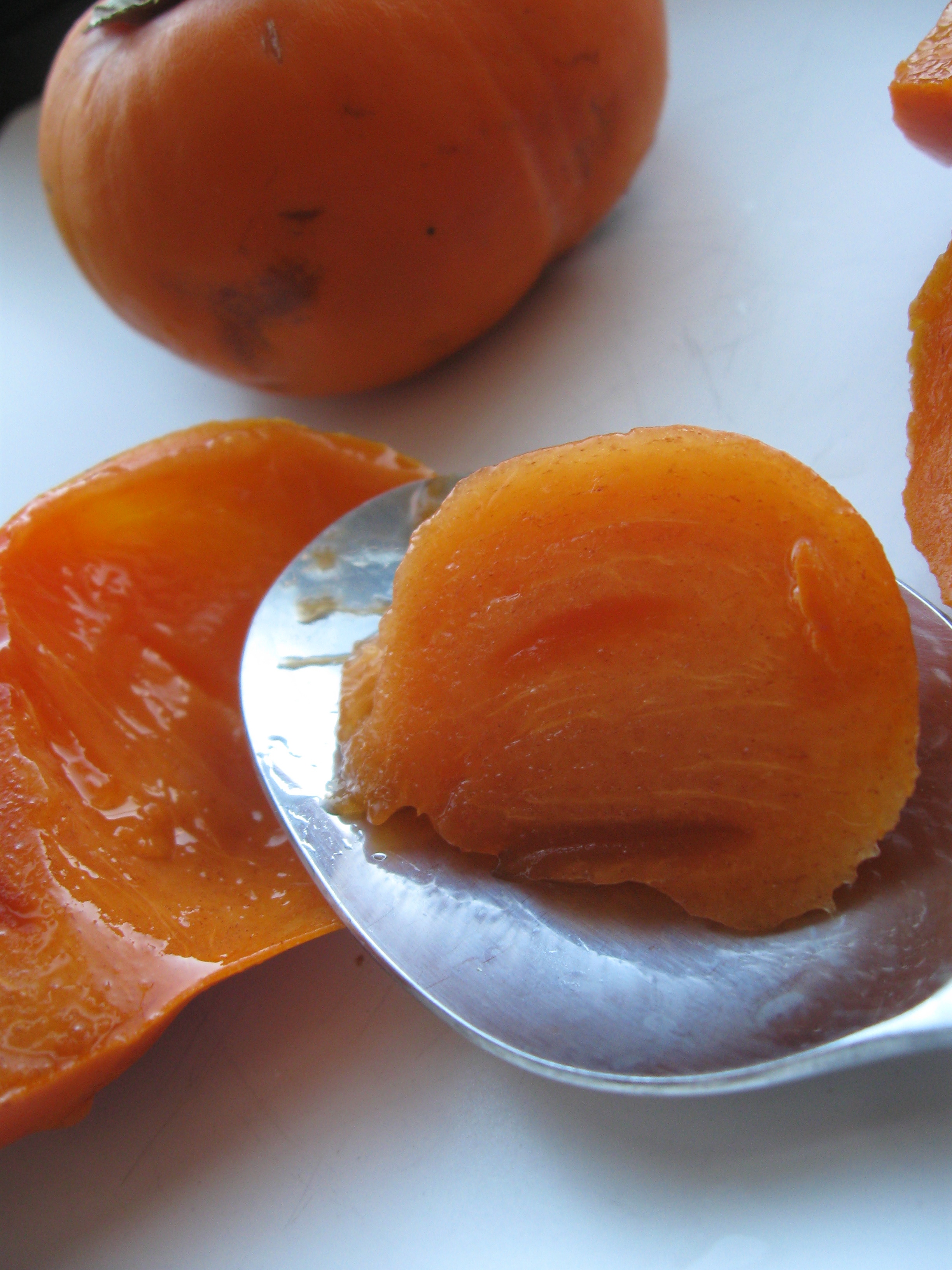So theres no recipe for this fruit but here is how to eat it and how to know when to eat it. There are two types of persimmons the one I have photographed below and one that looks like a heart. If you get the one that looks like a heart you have to let it get really ripe before eating it. The one that looks like a tomato should be kind of squishy when you grab it and have what look like bruises to know it is ready. You can also let it get even riper and it gains the texture of jelly. Now to eat it you just slice it, and scoop out the insides, do not eat the skins. I have provided a picture 😀
