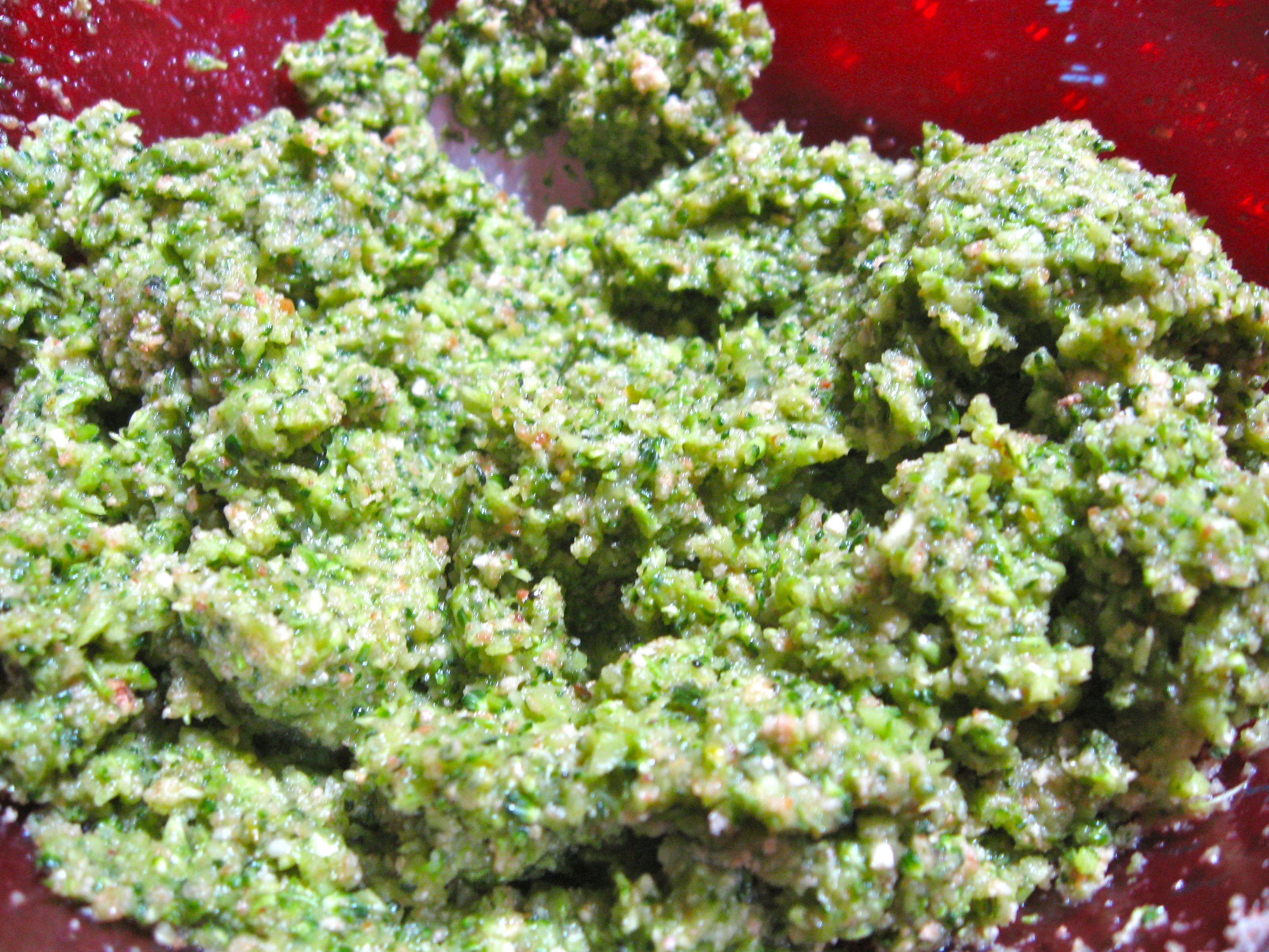 - in a large bowl combine the minced broccoli and garlic mixture with one egg and a generous sprinkle of bread crumbs