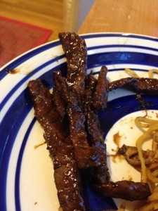 1. Marinate steak in a bag with teriyaki and a few splashes of pineapple juice