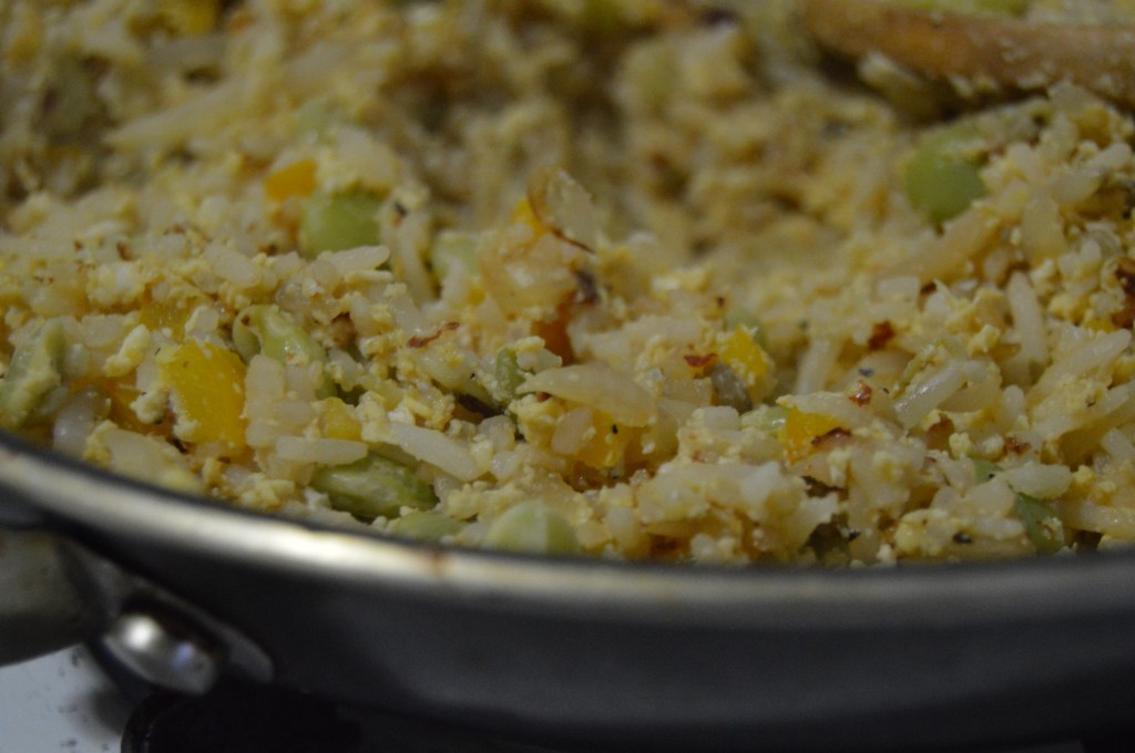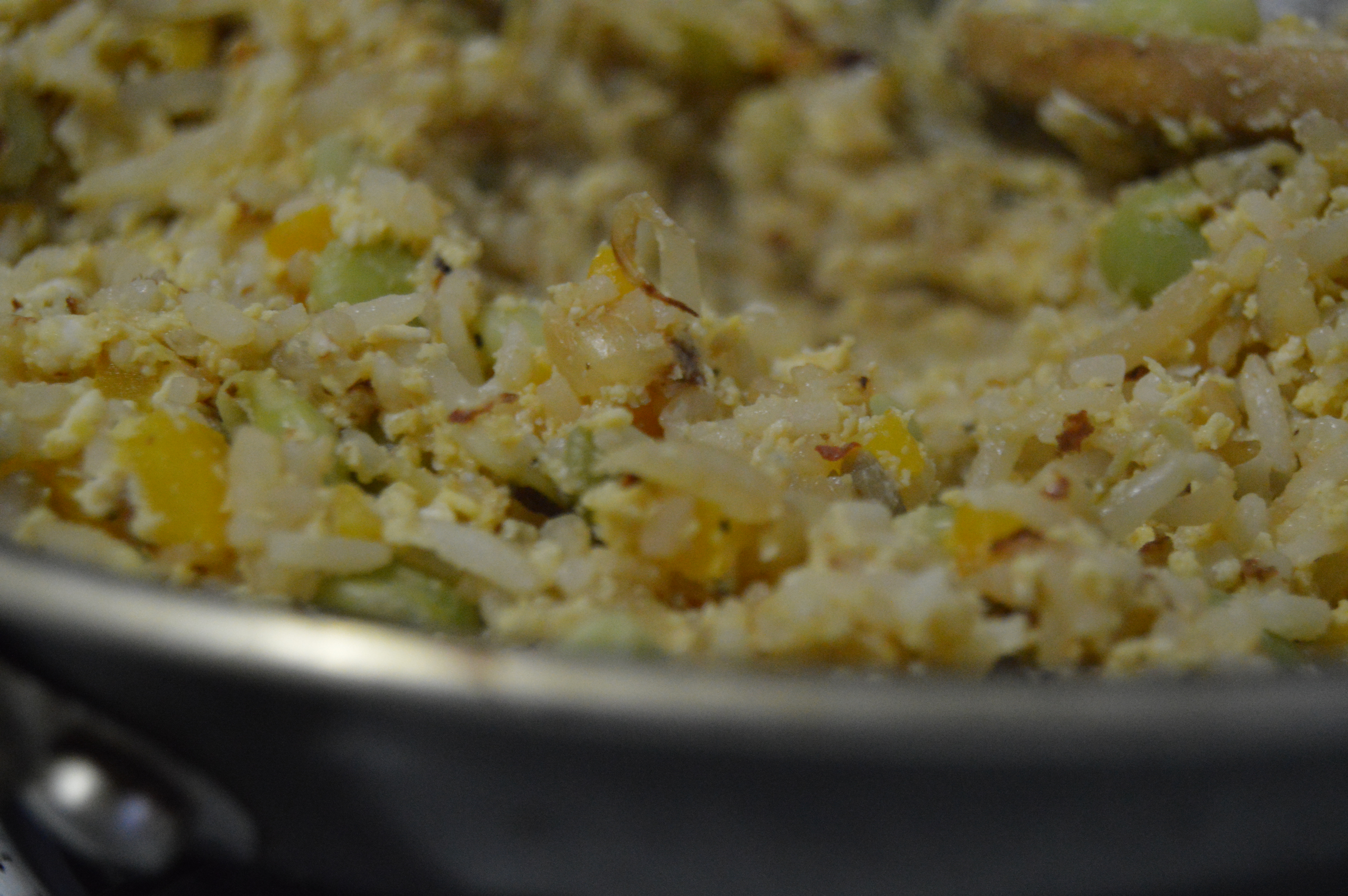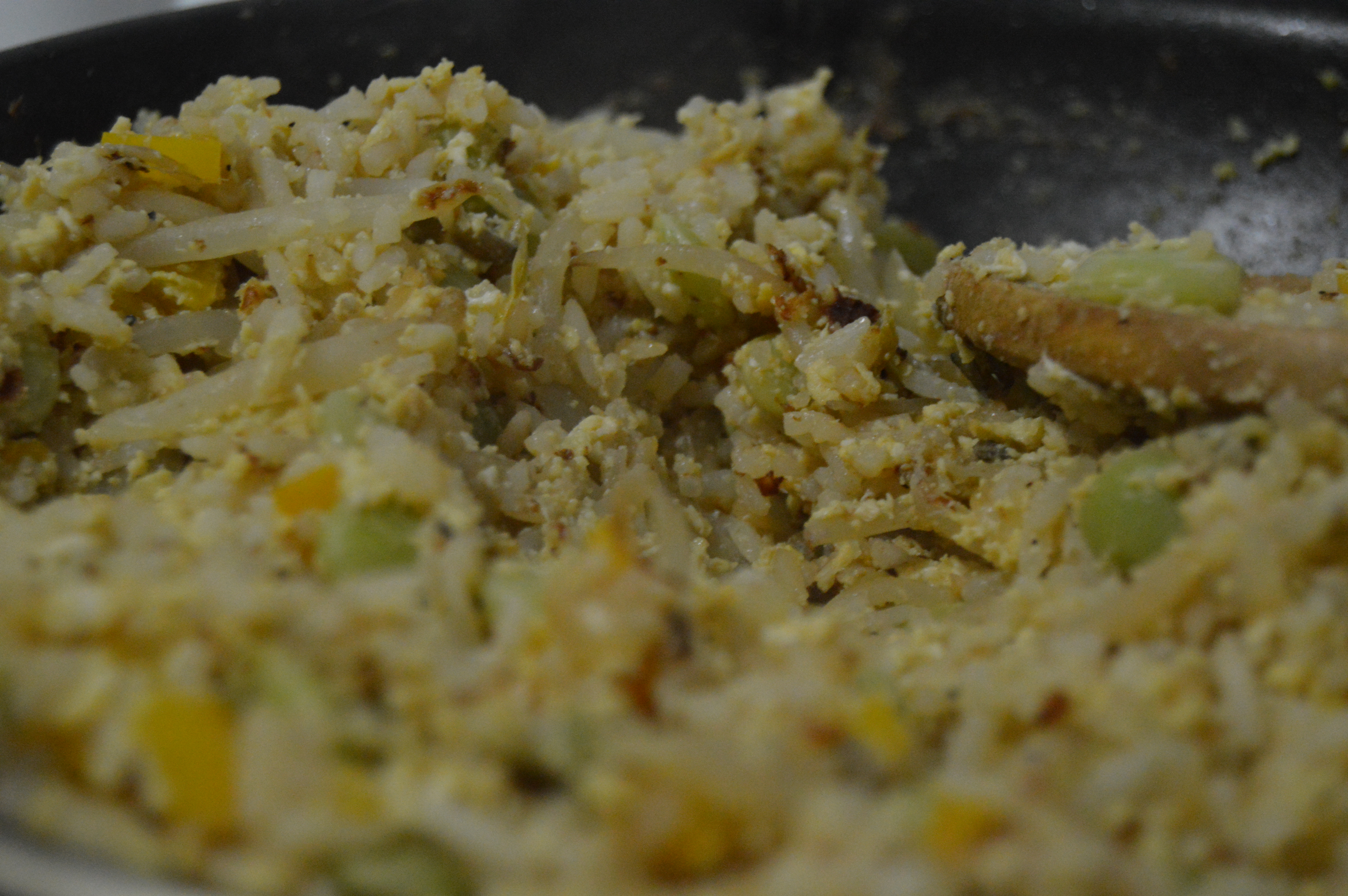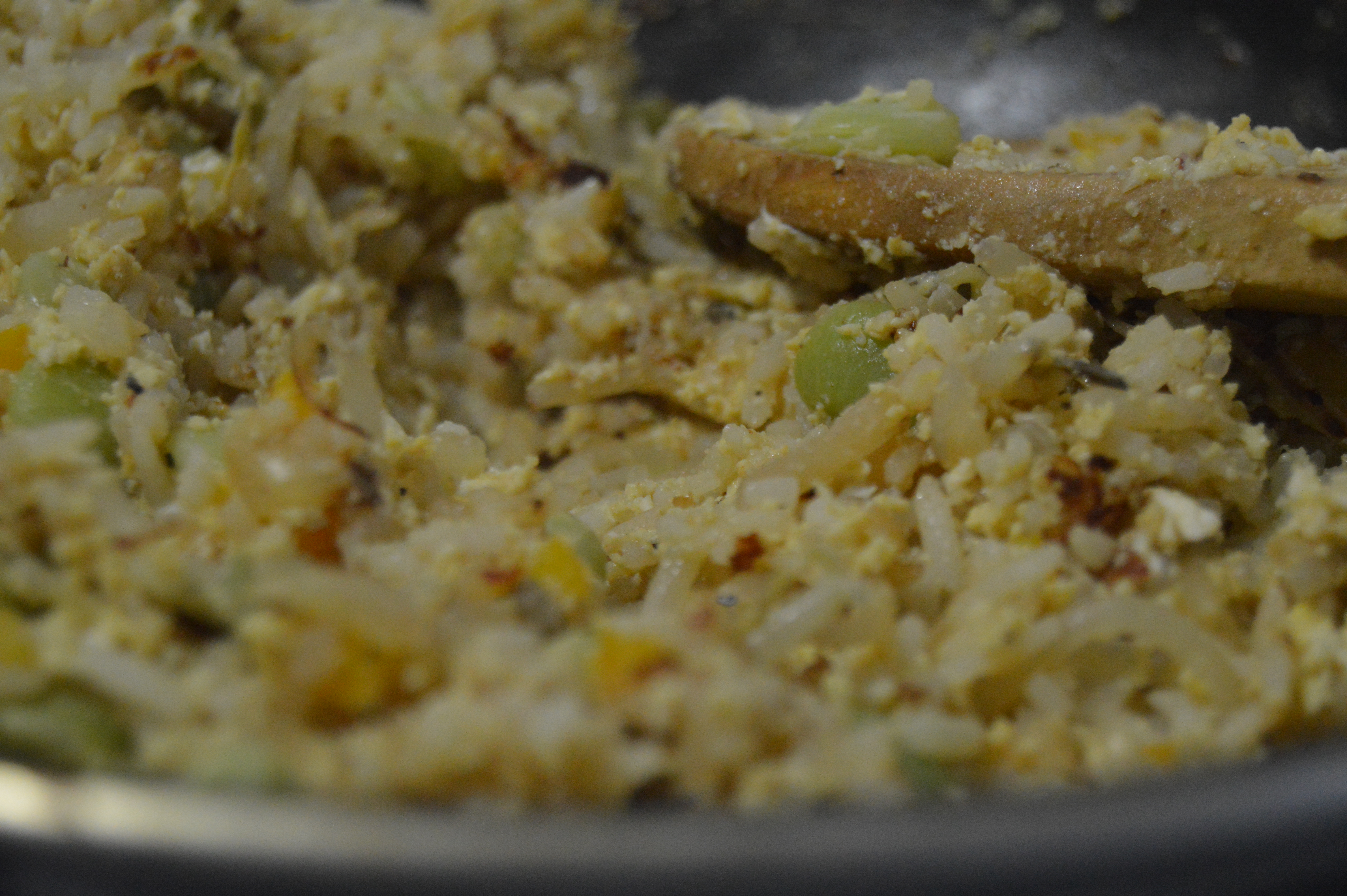 - Turn the head up a little bit and add the egg to the rice and veggie mixture.