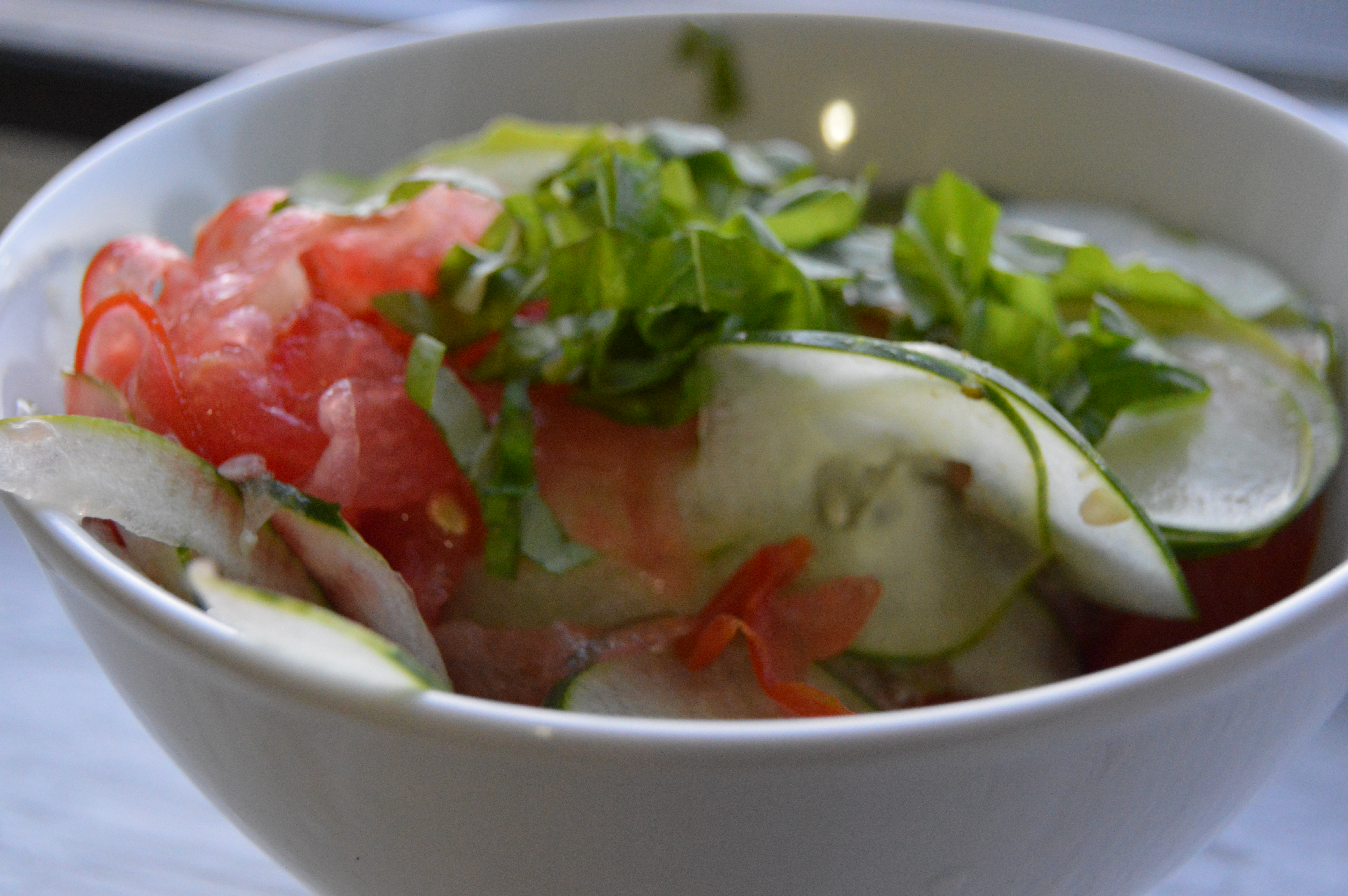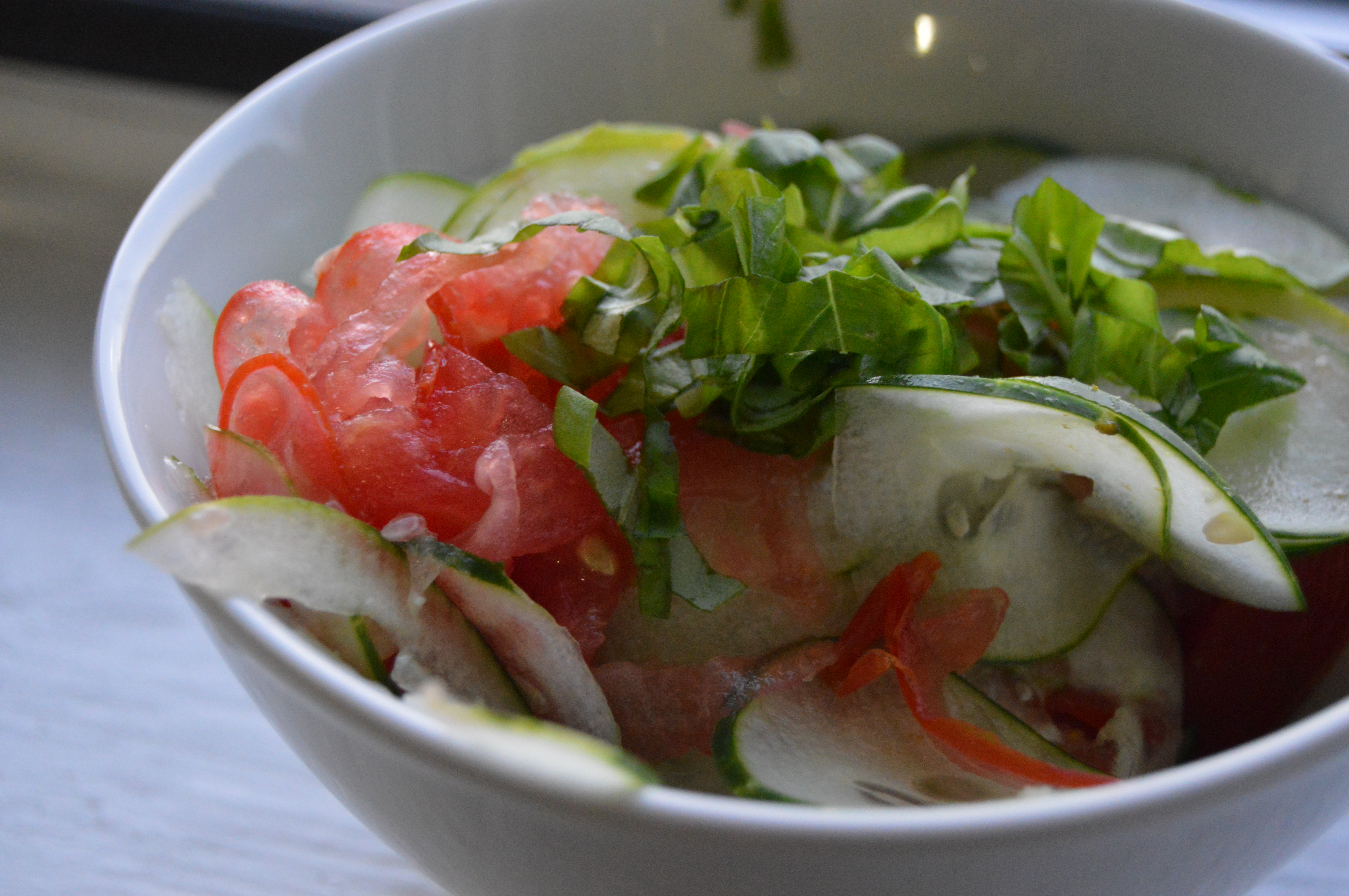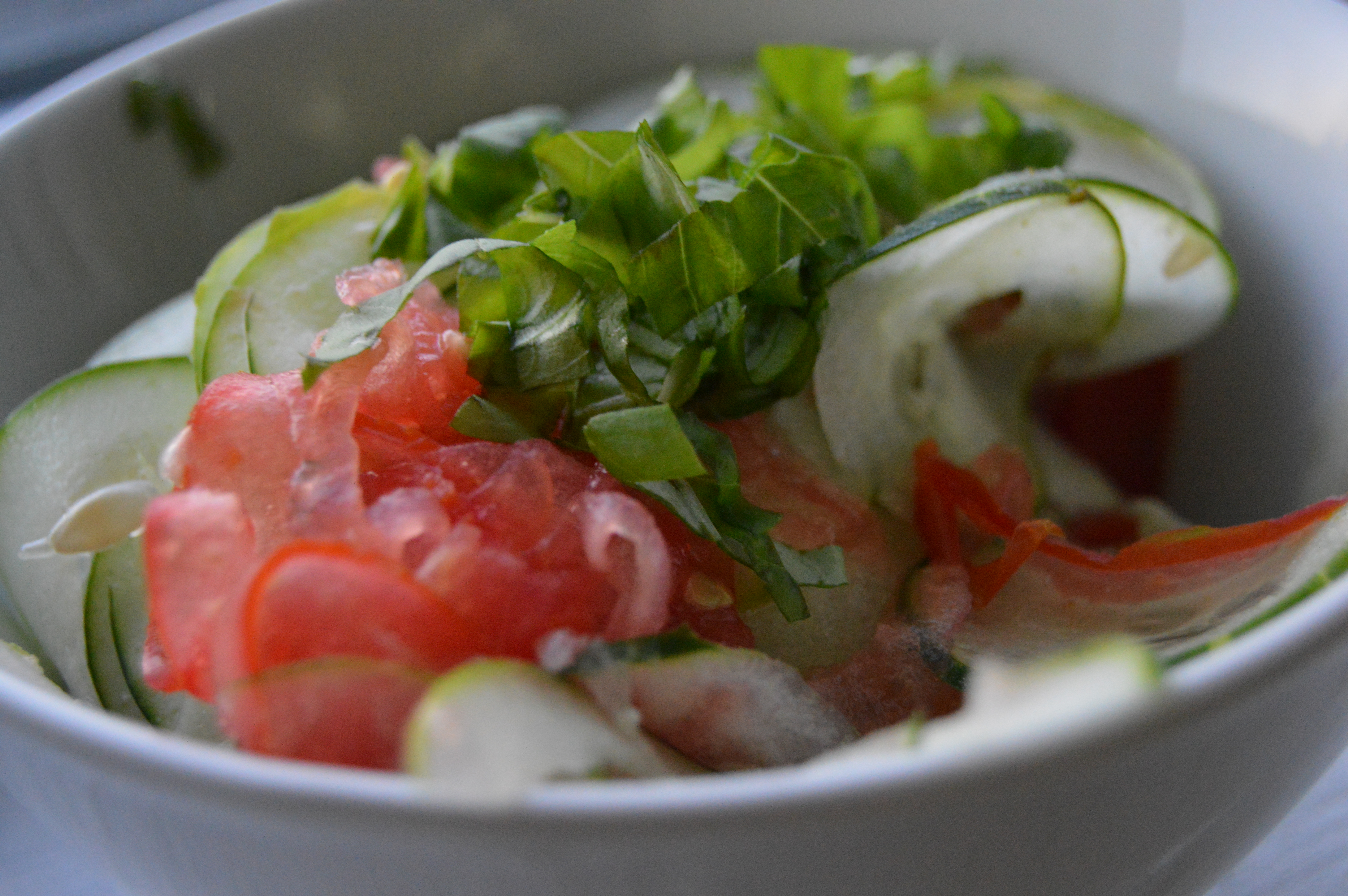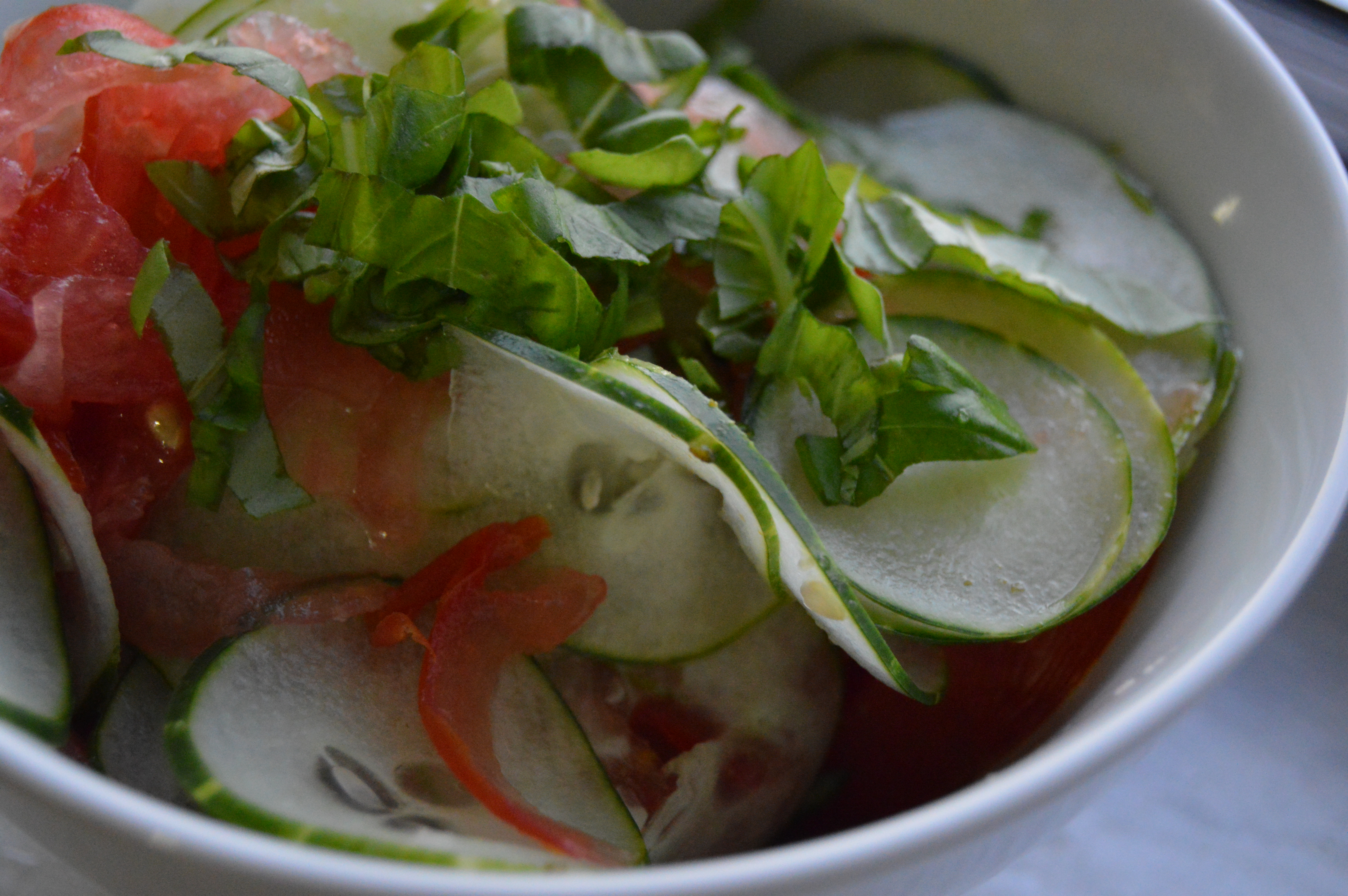 - If you do not have a stiff tomato, I would suggest not using the mandolin because it will all just be mushy. Either way, slice up your tomato and cucumber.