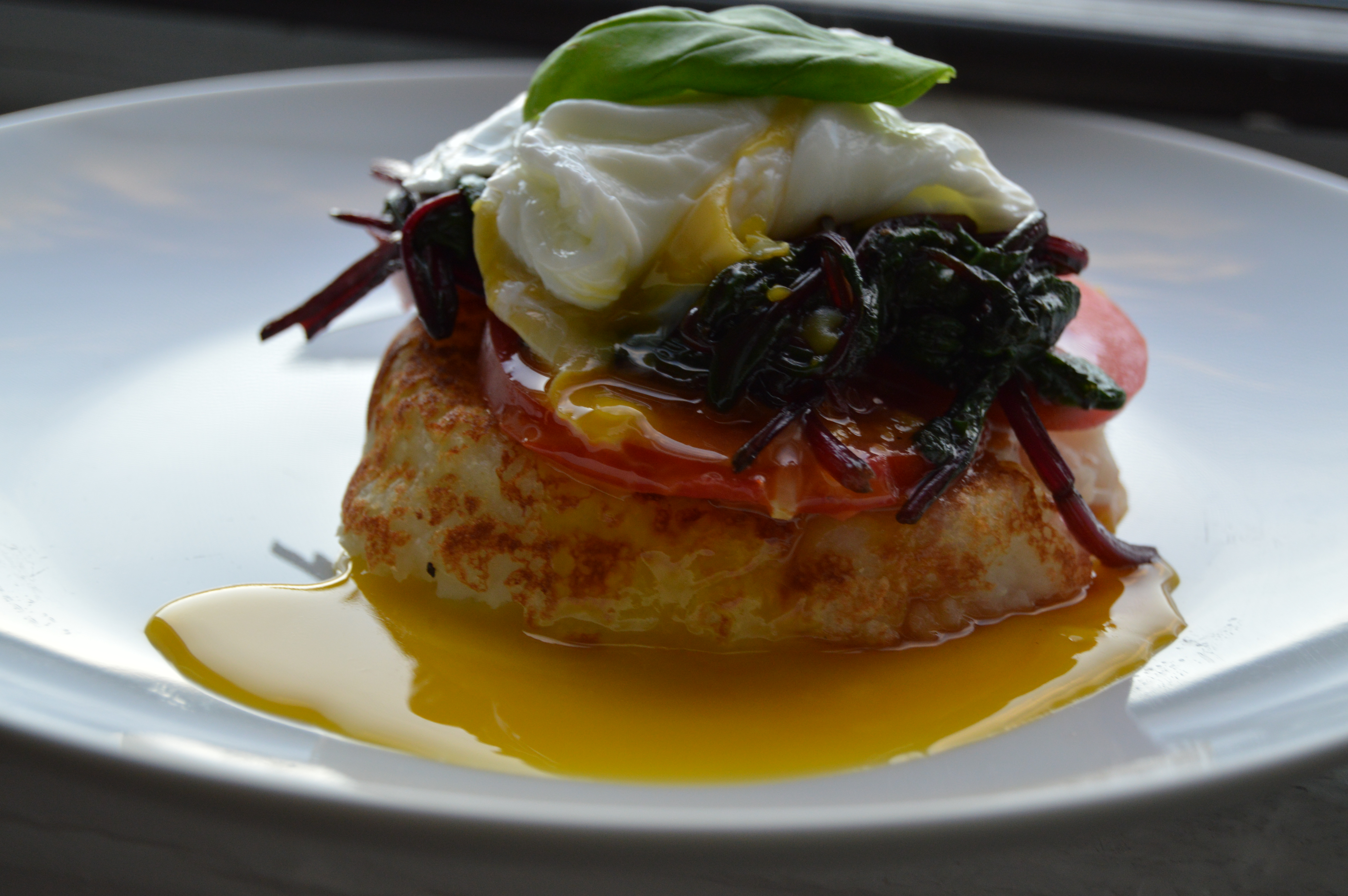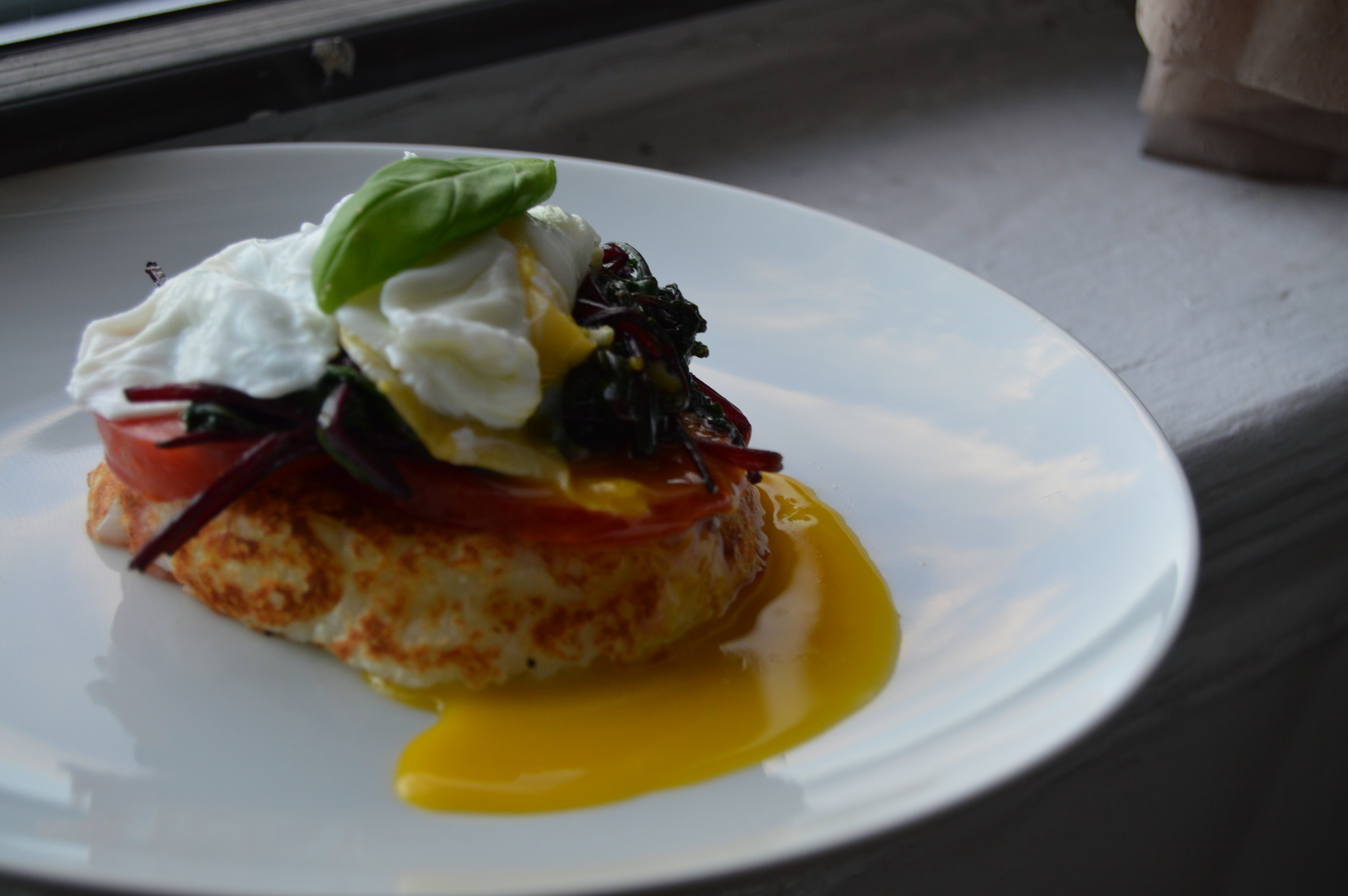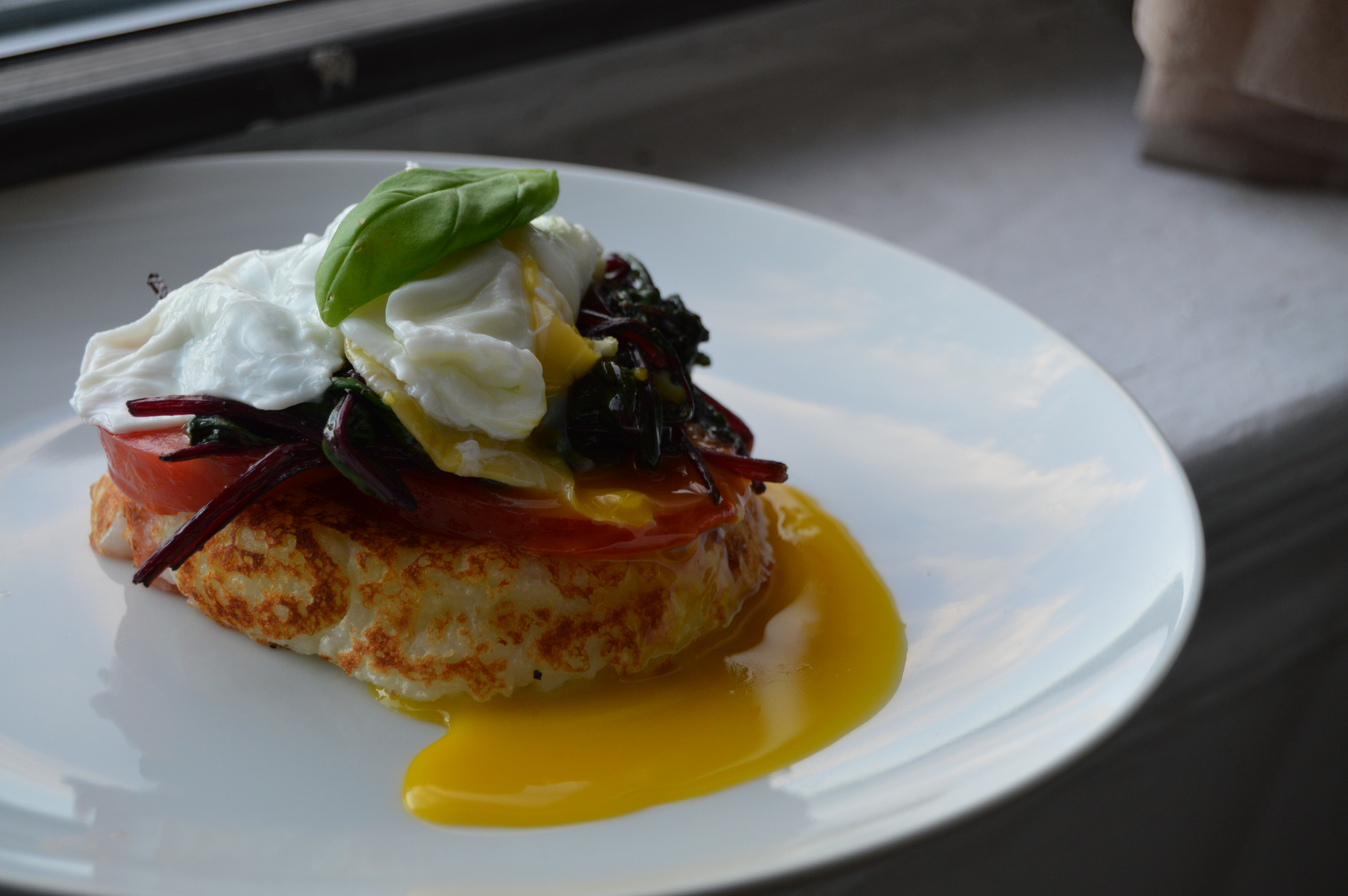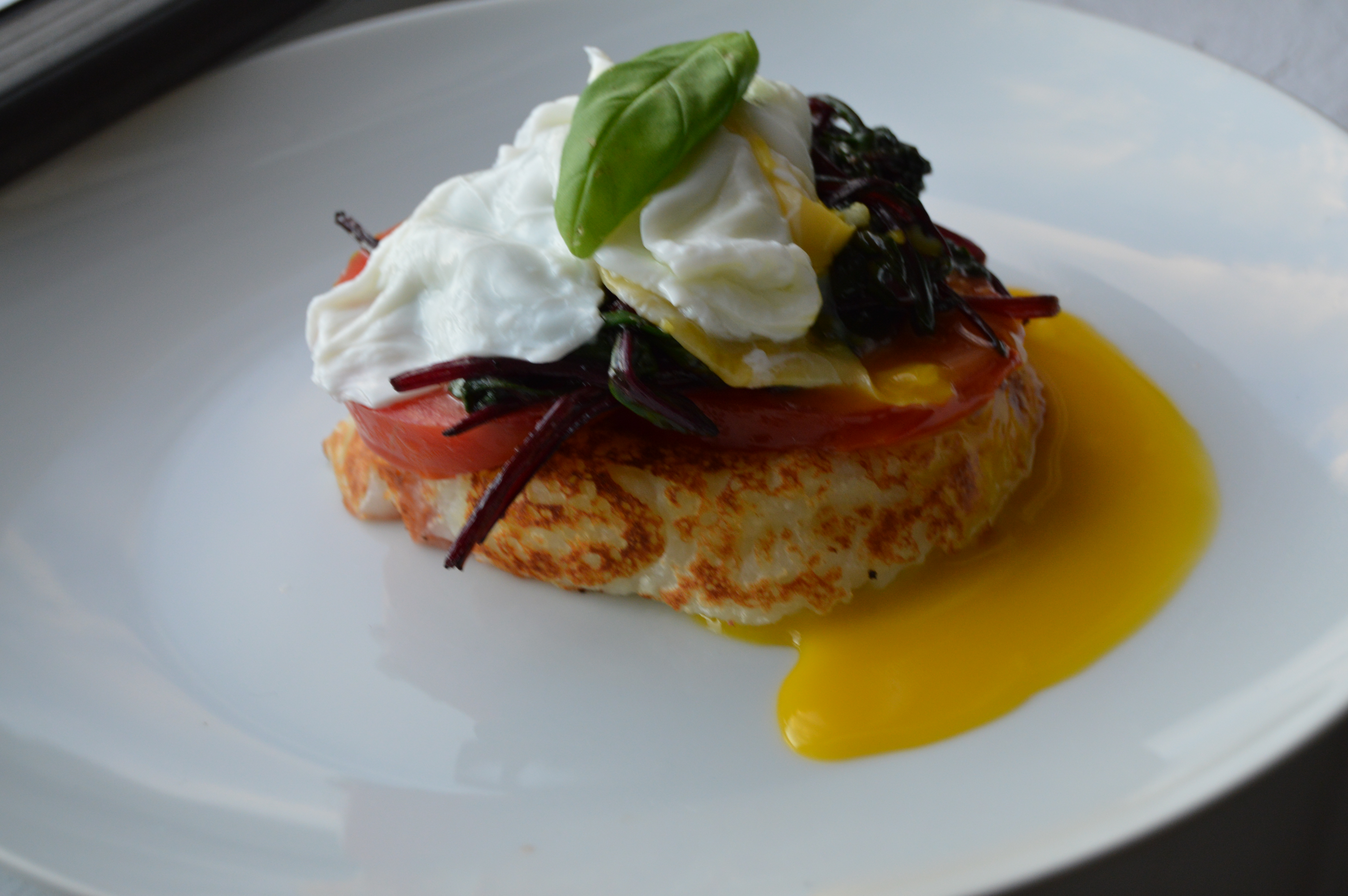 So here is what it was: A mashed potato cake, with sautéed beet greens, tomato, and a poached egg.  It was beautiful.  Literally a piece of art I felt bad about eating.  But once I did eat it, I fell in love.  If you don’t know, I don’t like eggs.  There are very few instances that I will eat them, but a few weeks ago I went to brunch and got an eggs benedict, and it was really good.  As today dragged on I started to think “what do I want for dinner?” now I am a strict “no breakfast for dinner” kind of person, but these beet greens were calling my name and I just had to try this recipe.  This was my first ever time making a poached egg (I marginally failed) and first time working with the beet greens.  This recipe looks beautiful, tastes phenomenal, and by far was the most elegant recipe I have ever made.