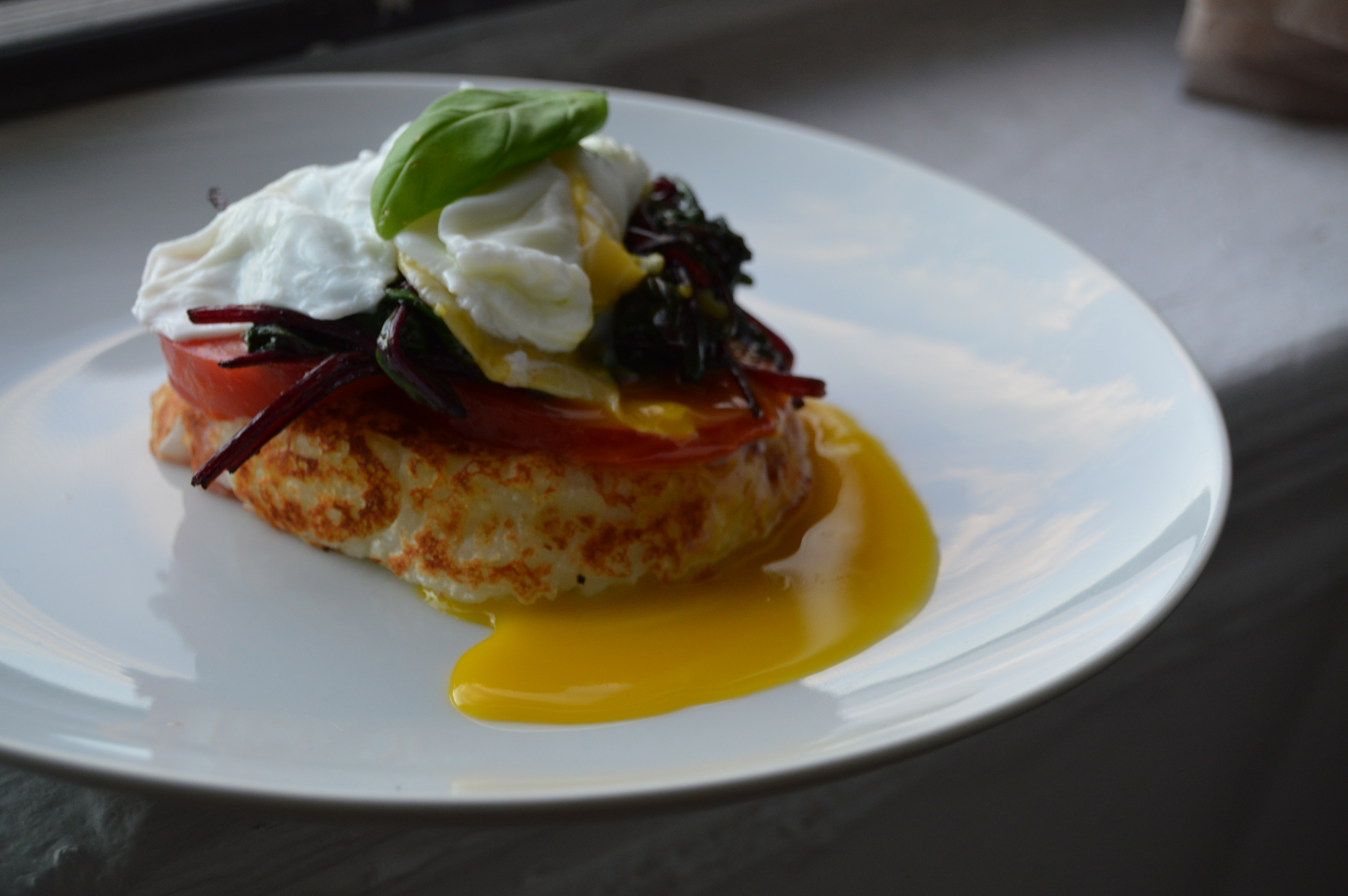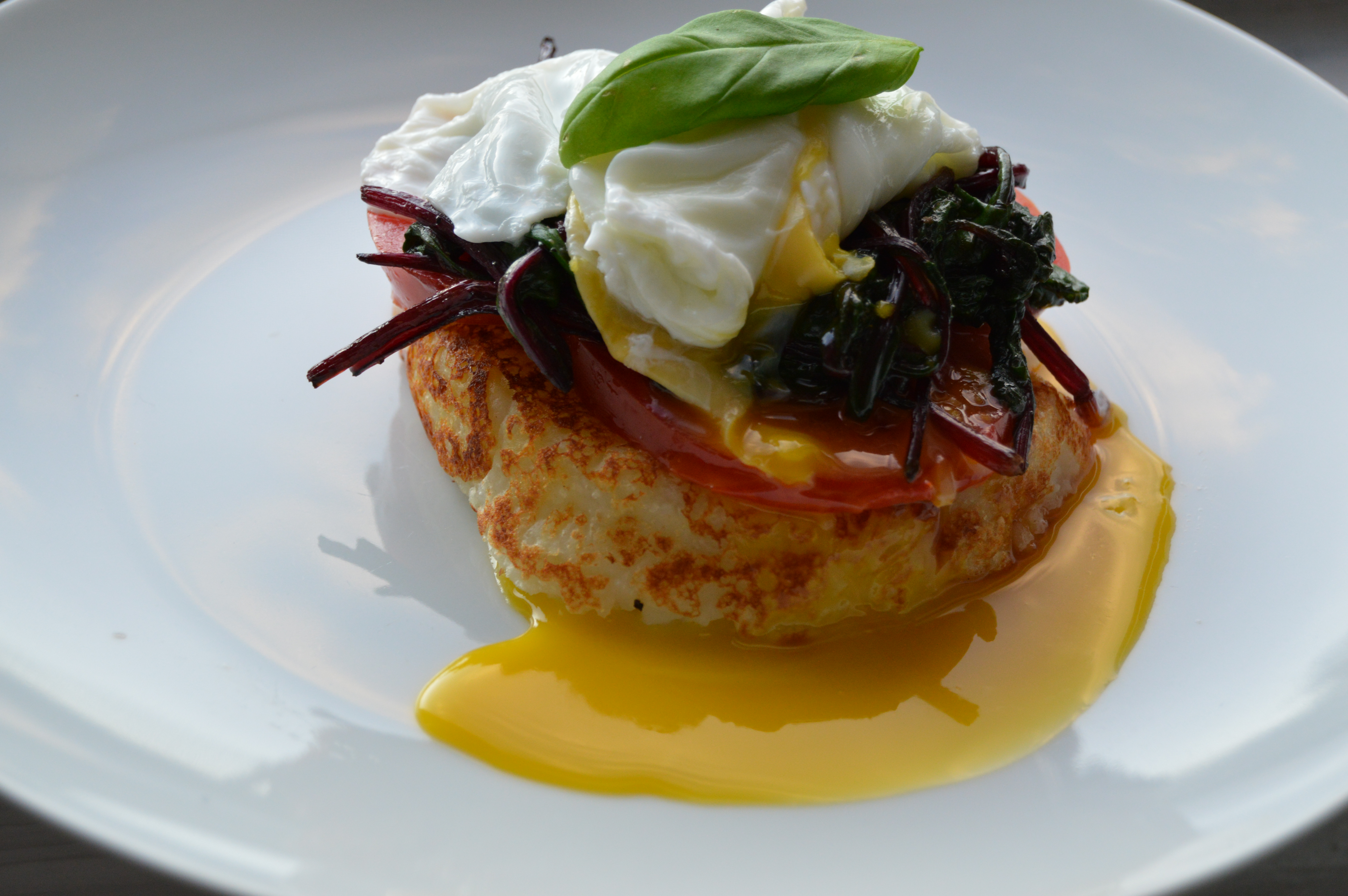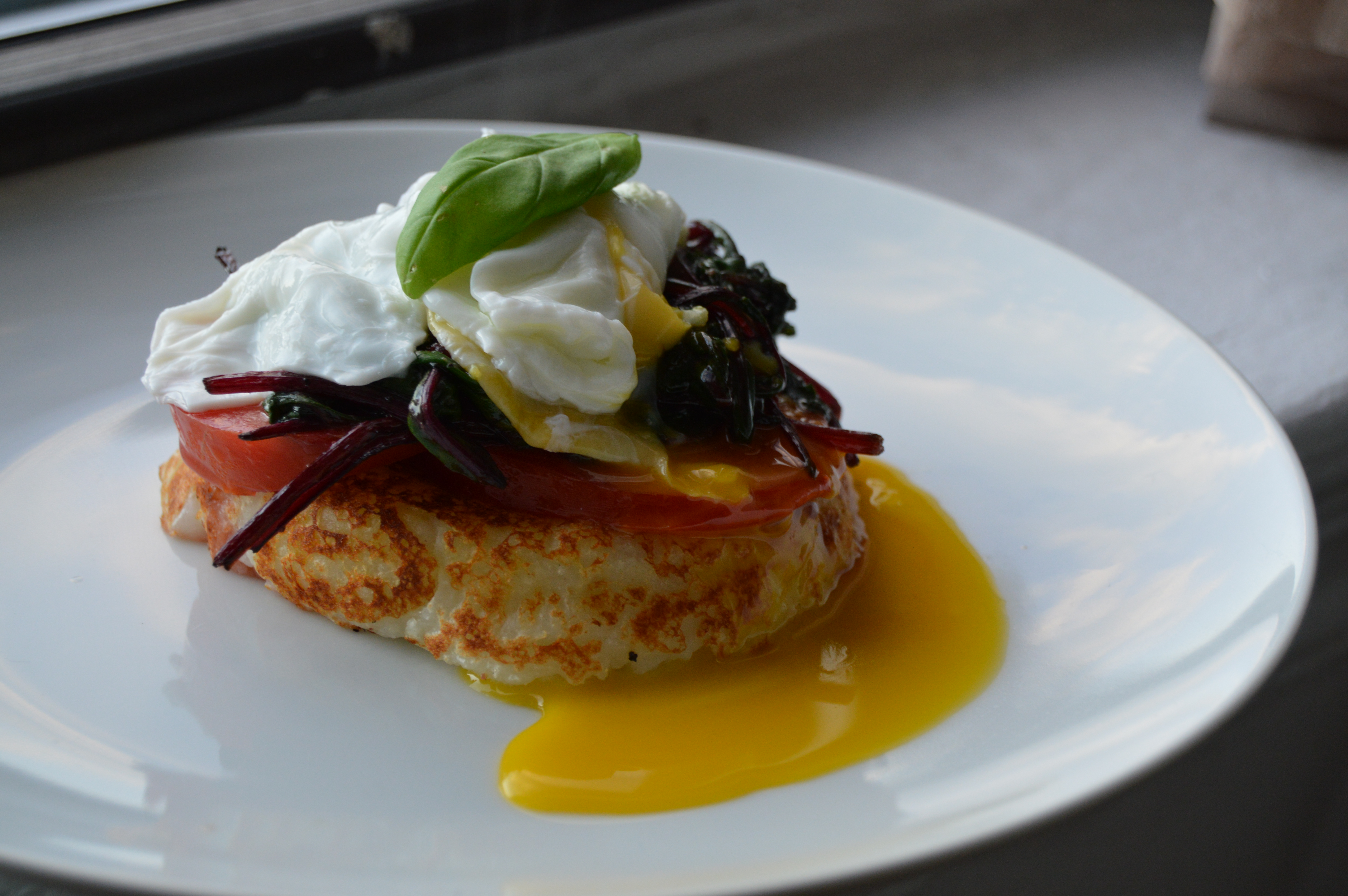 So here is what it was: A mashed potato cake, with sautéed beet greens, tomato, and a poached egg.  It was beautiful.  Literally a piece of art I felt bad about eating.  But once I did eat it, I fell in love.  If you don’t know, I don’t like eggs.  There are very few instances that I will eat them, but a few weeks ago I went to brunch and got an eggs benedict, and it was really good.  As today dragged on I started to think “what do I want for dinner?” now I am a strict “no breakfast for dinner” kind of person, but these beet greens were calling my name and I just had to try this recipe.  This was my first ever time making a poached egg (I marginally failed) and first time working with the beet greens.  This recipe looks beautiful, tastes phenomenal, and by far was the most elegant recipe I have ever made.