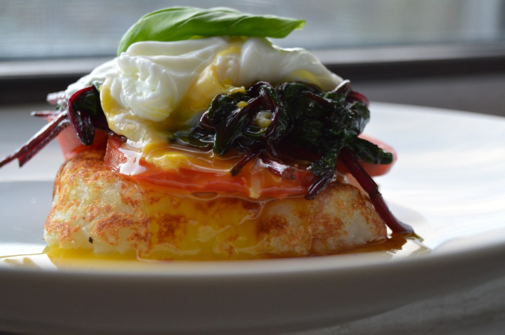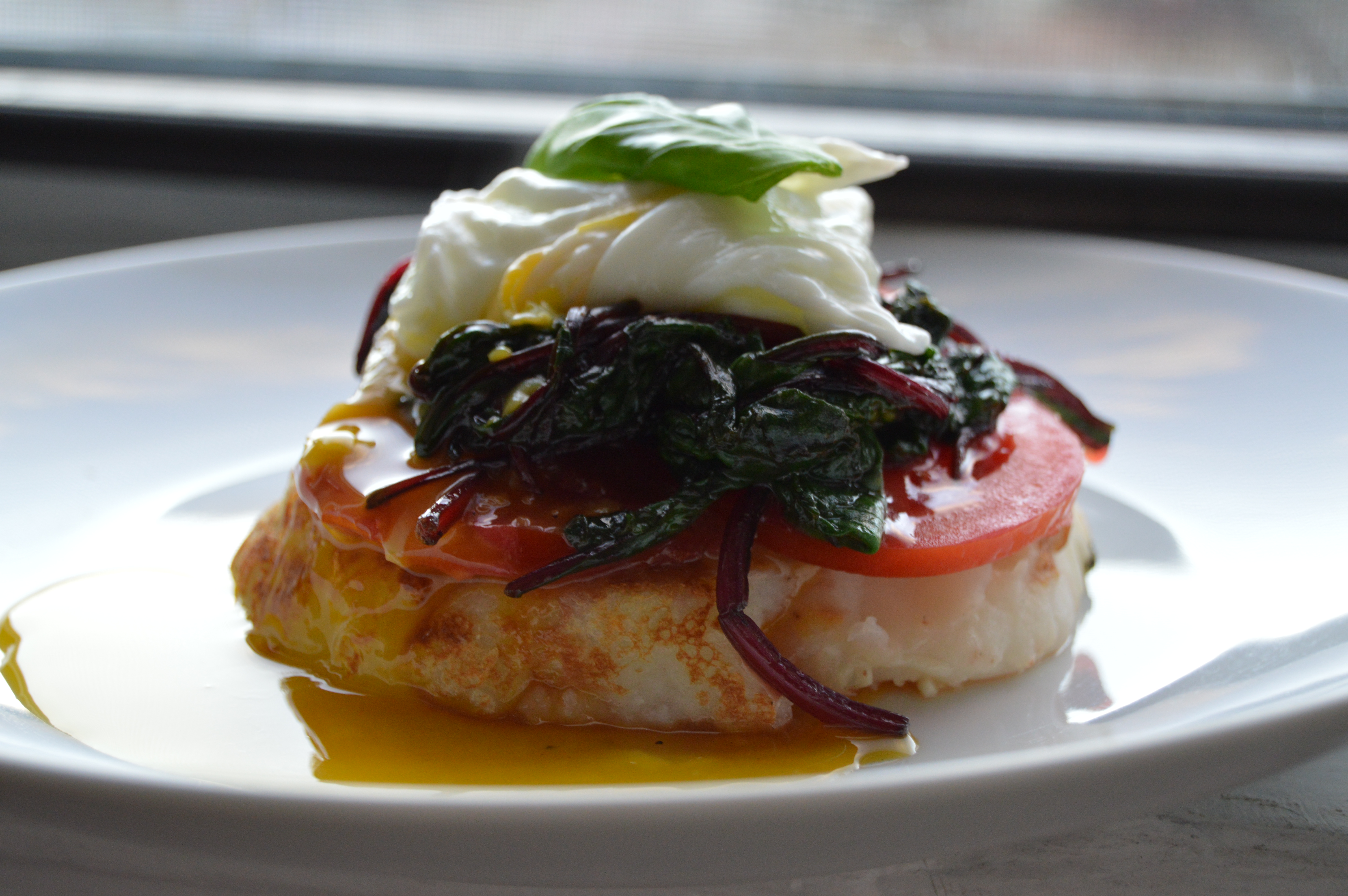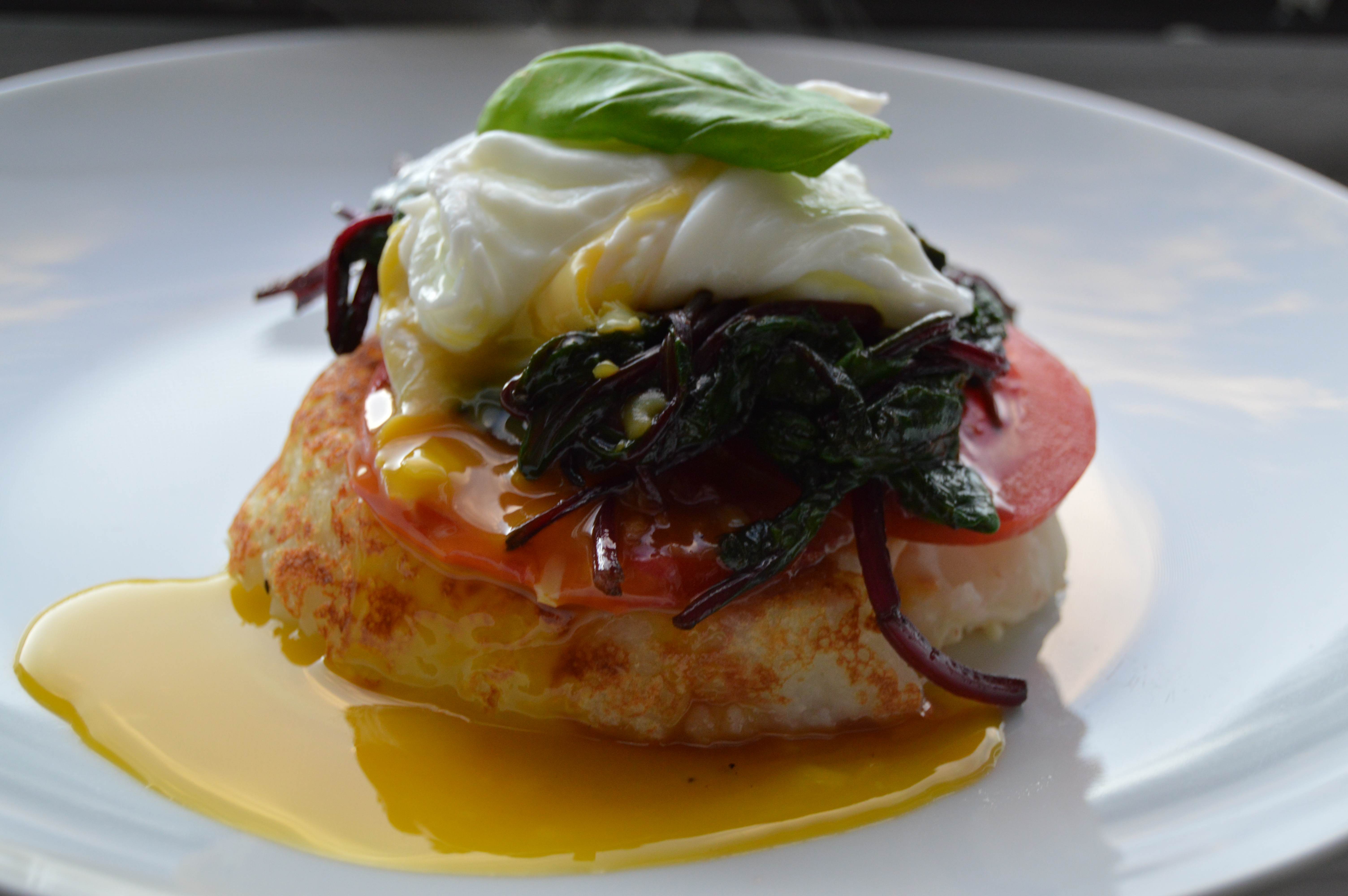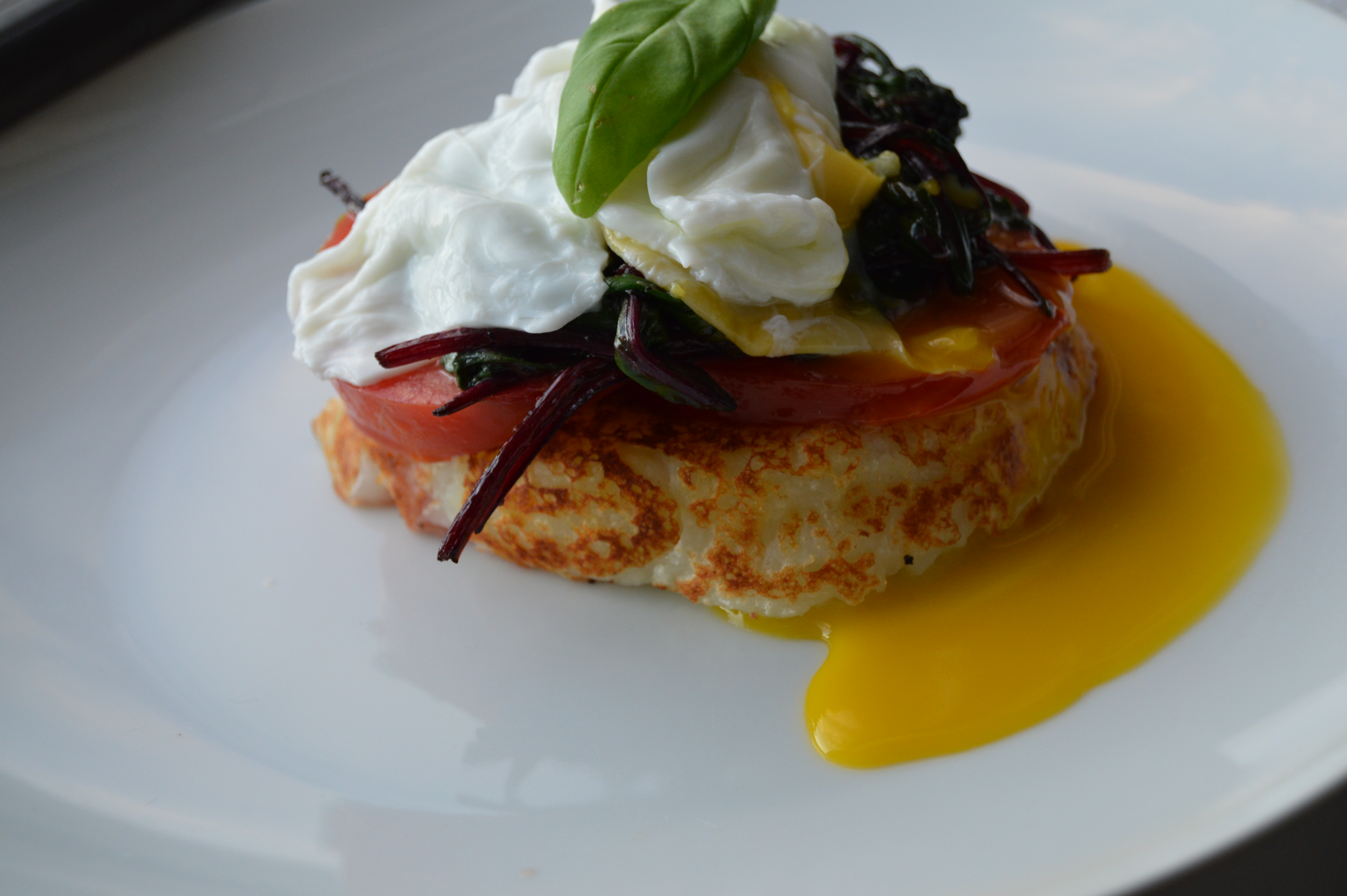 So here is what it was: A mashed potato cake, with sautéed beet greens, tomato, and a poached egg.  It was beautiful.  Literally a piece of art I felt bad about eating.  But once I did eat it, I fell in love.  If you don’t know, I don’t like eggs.  There are very few instances that I will eat them, but a few weeks ago I went to brunch and got an eggs benedict, and it was really good.  As today dragged on I started to think “what do I want for dinner?” now I am a strict “no breakfast for dinner” kind of person, but these beet greens were calling my name and I just had to try this recipe.  This was my first ever time making a poached egg (I marginally failed) and first time working with the beet greens.  This recipe looks beautiful, tastes phenomenal, and by far was the most elegant recipe I have ever made.