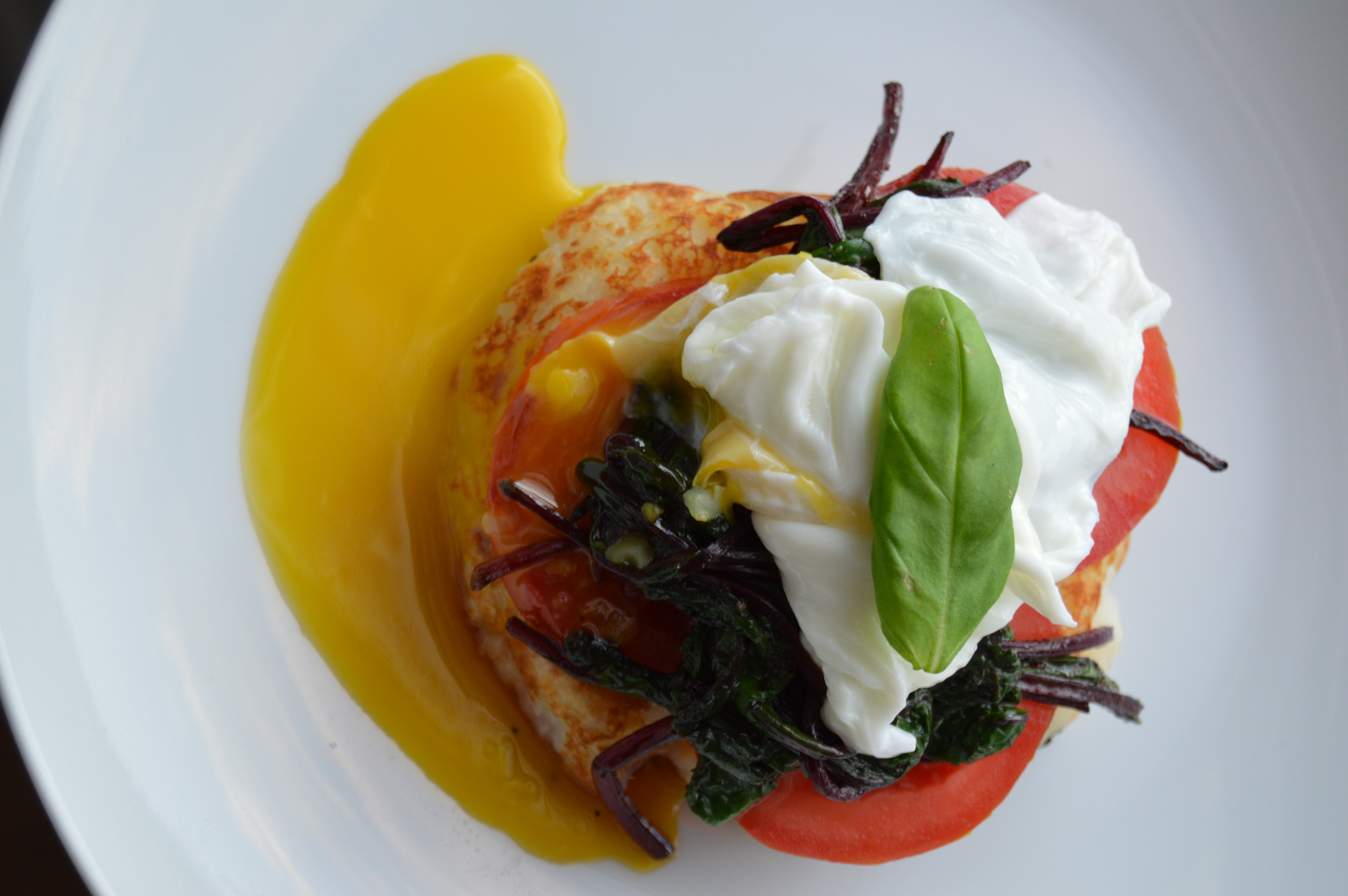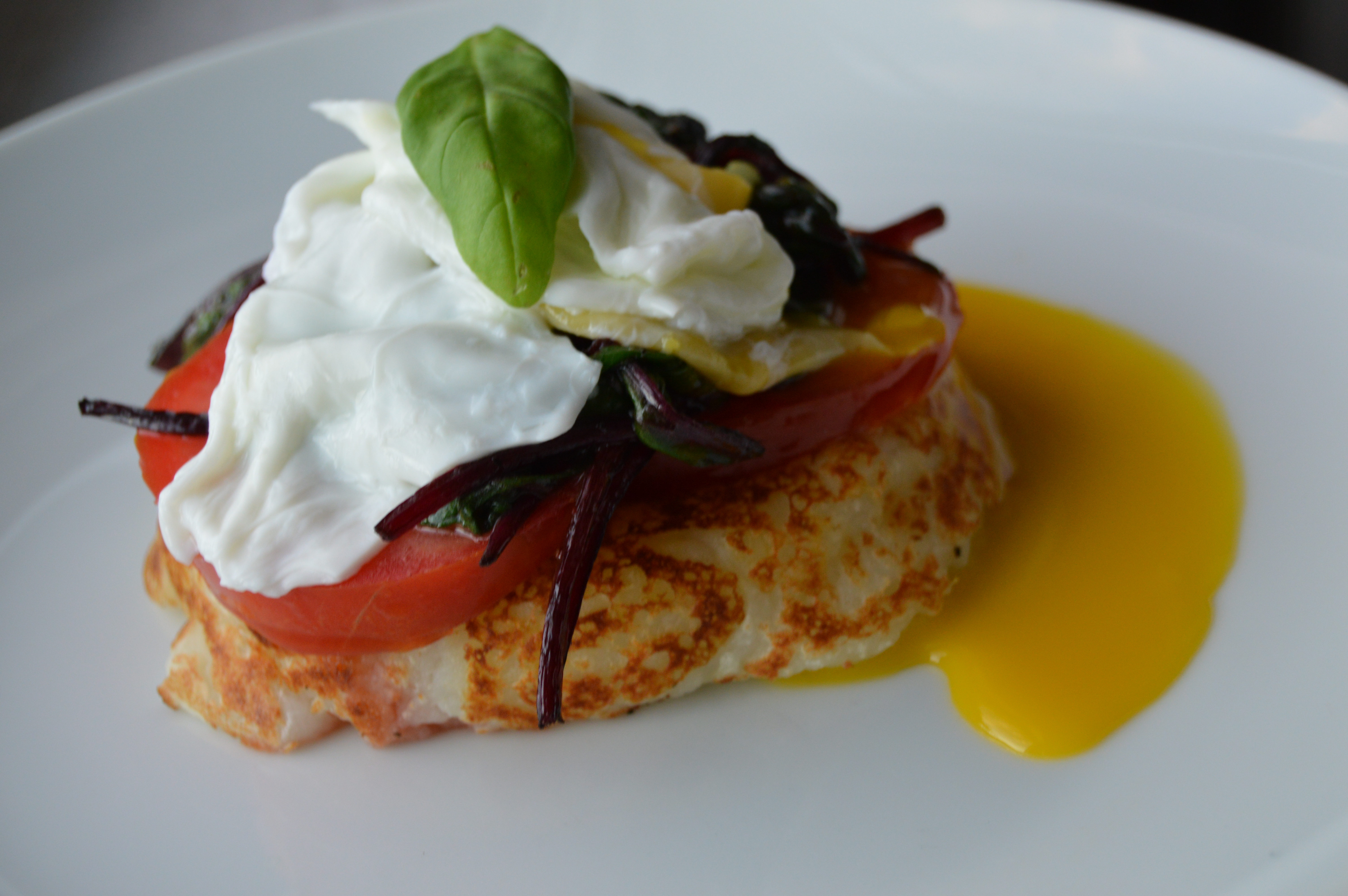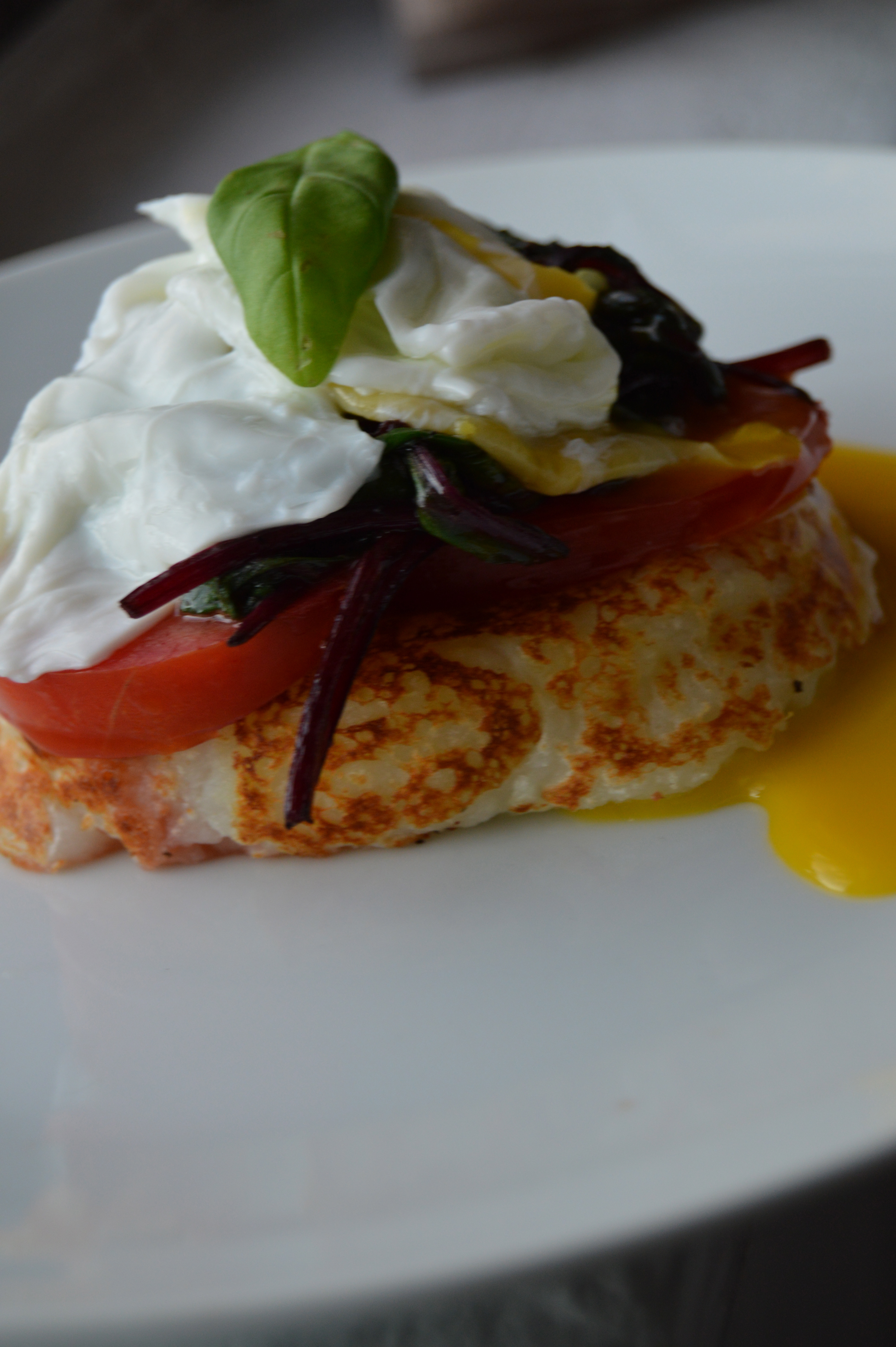 4. Then layer everything up, the potato cake on the bottom, then the fresh sliced tomato, then your beet greens, then pesto if you have it.