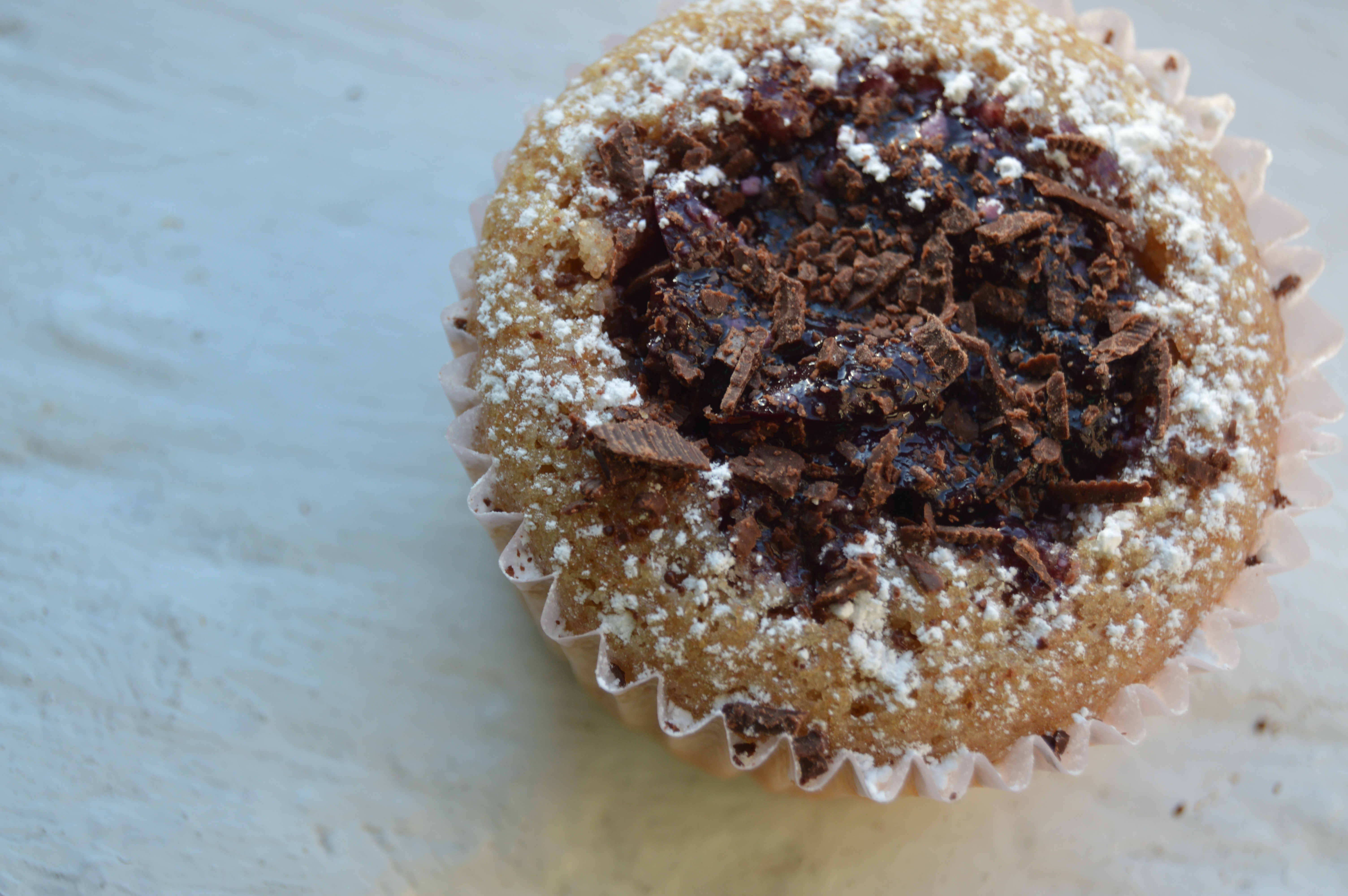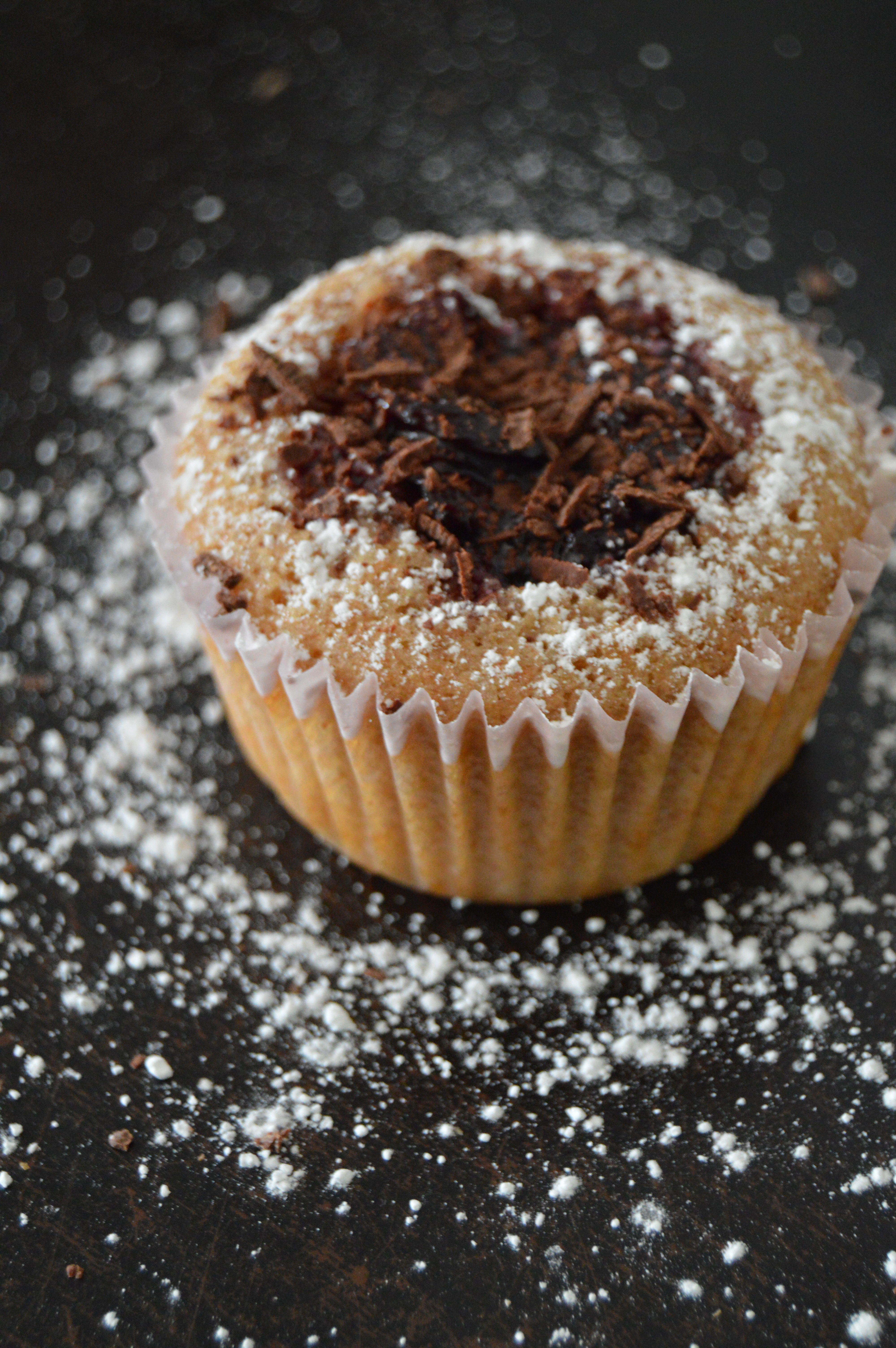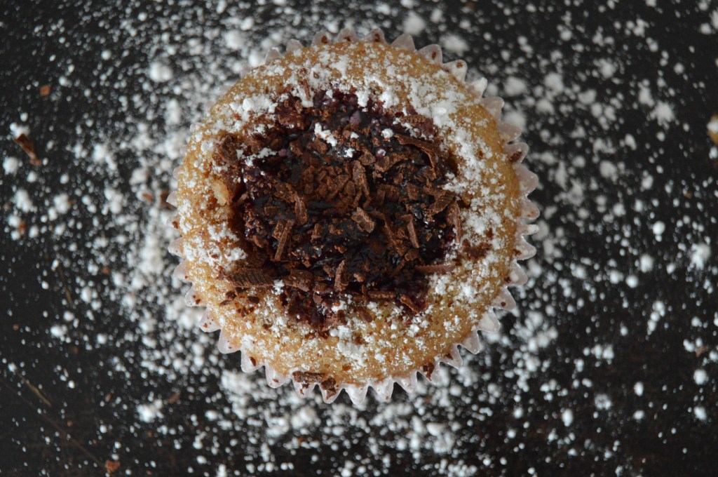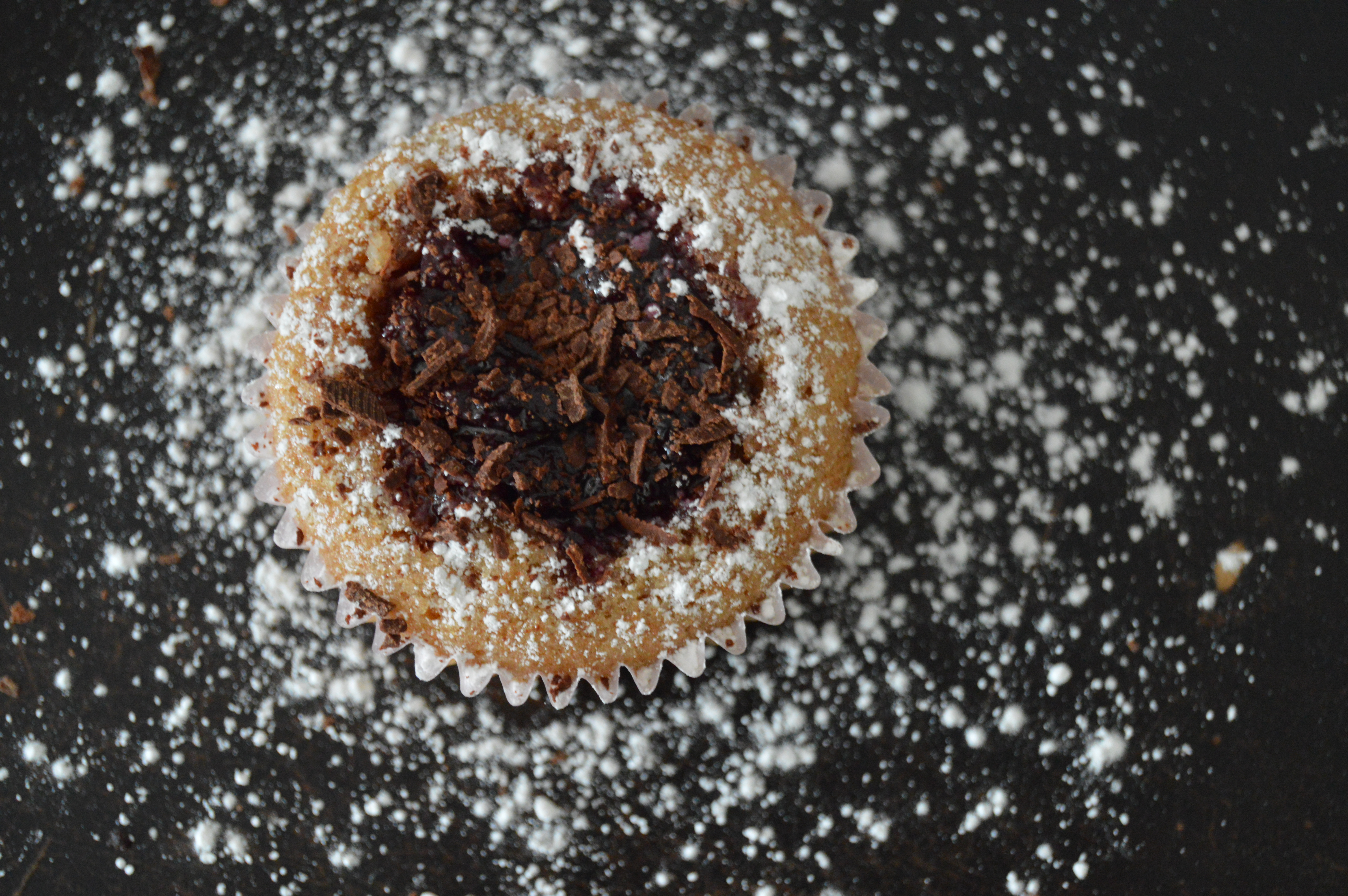 - Then gently make a little well in the middle of your cupcake. Add in some compote. Sprinkle with powdered sugar and chocolate shavings and enjoy!