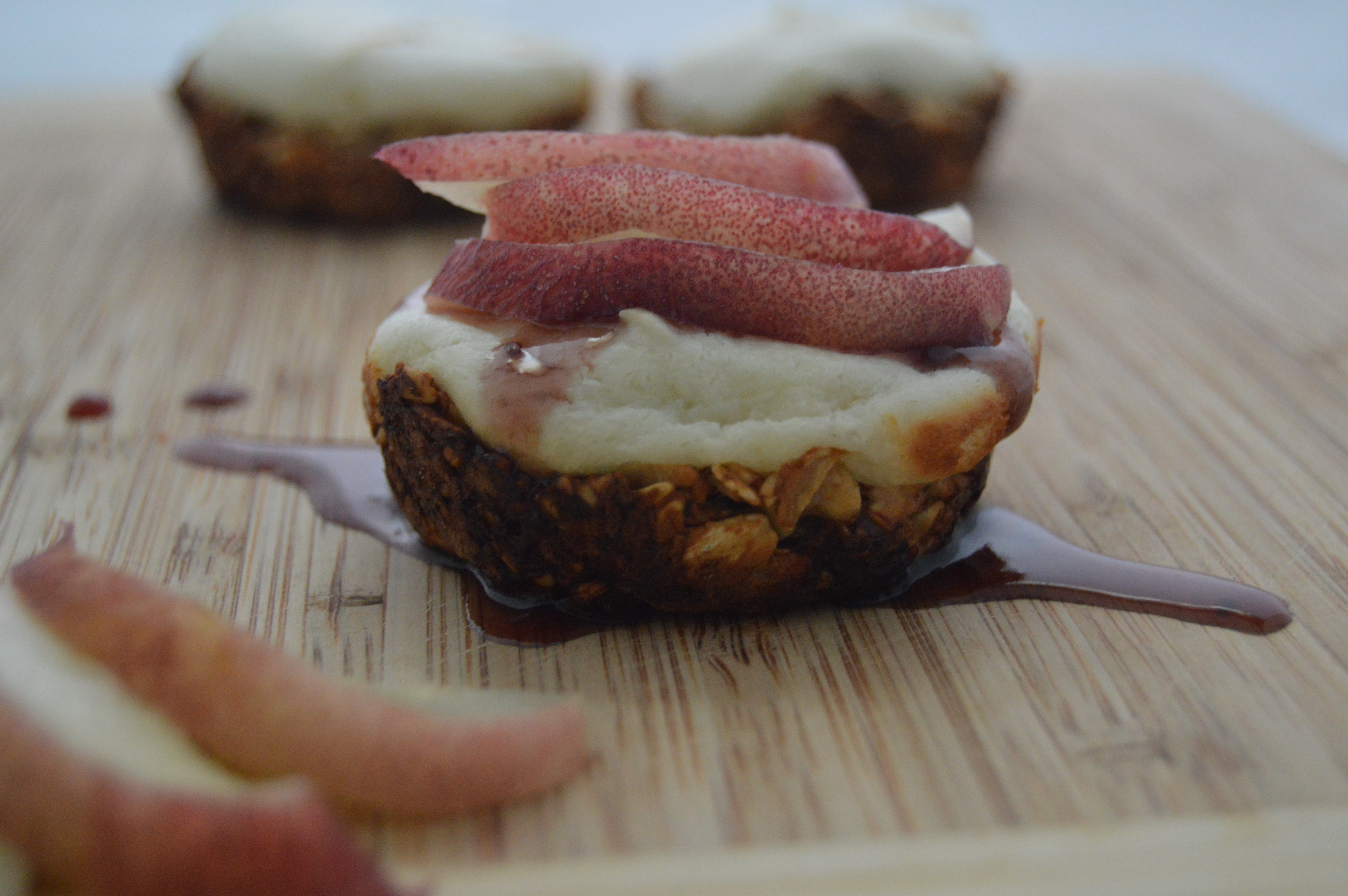 - Mix together the banana, oats, nuts, coconut, and spices. Fill a cupcake tin 1/2 way with this mixture. Pack it in so it is solid.