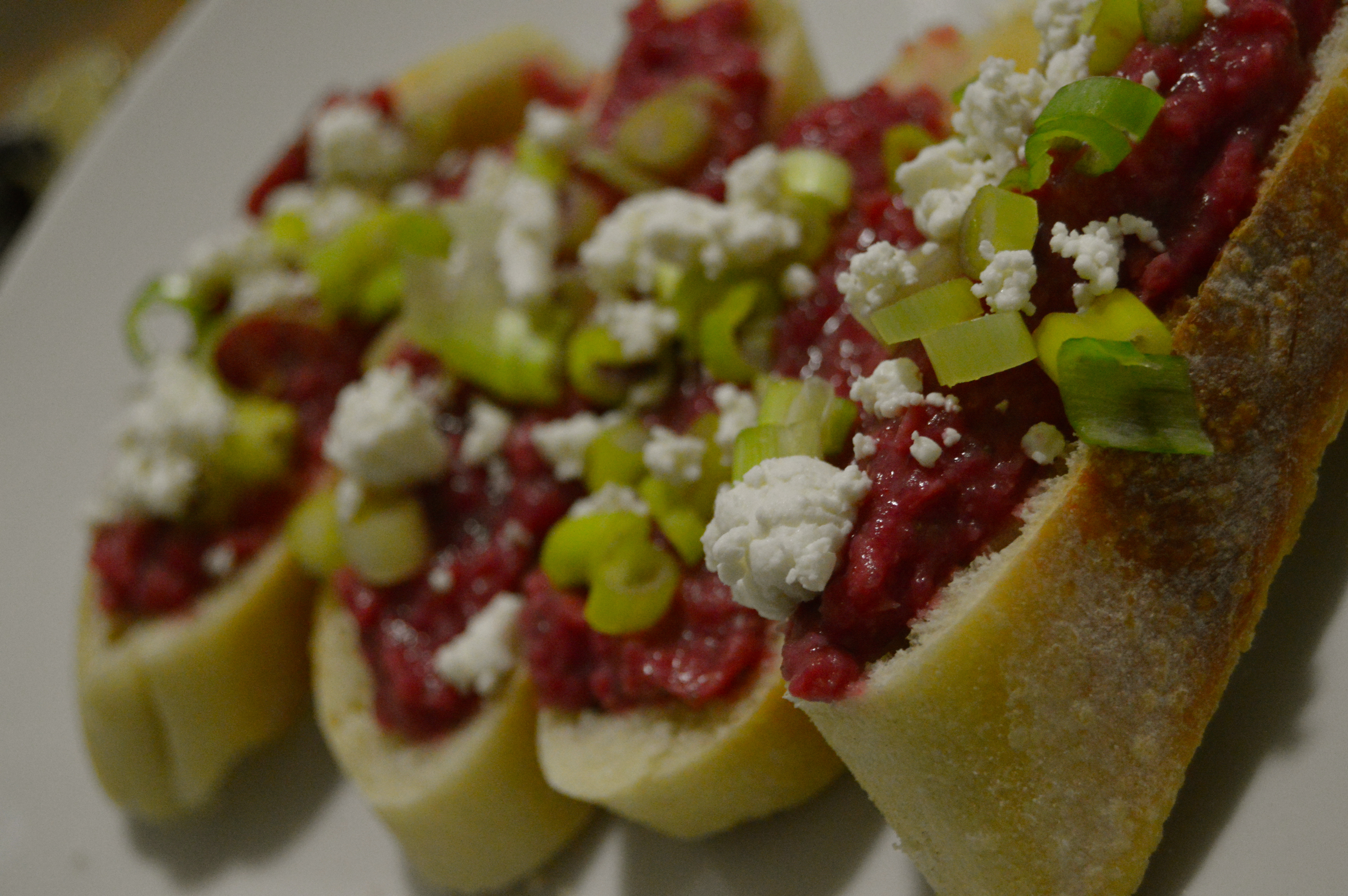 - Spread on a toasted piece of baguette and then crumble the goat cheese and scallions on top.