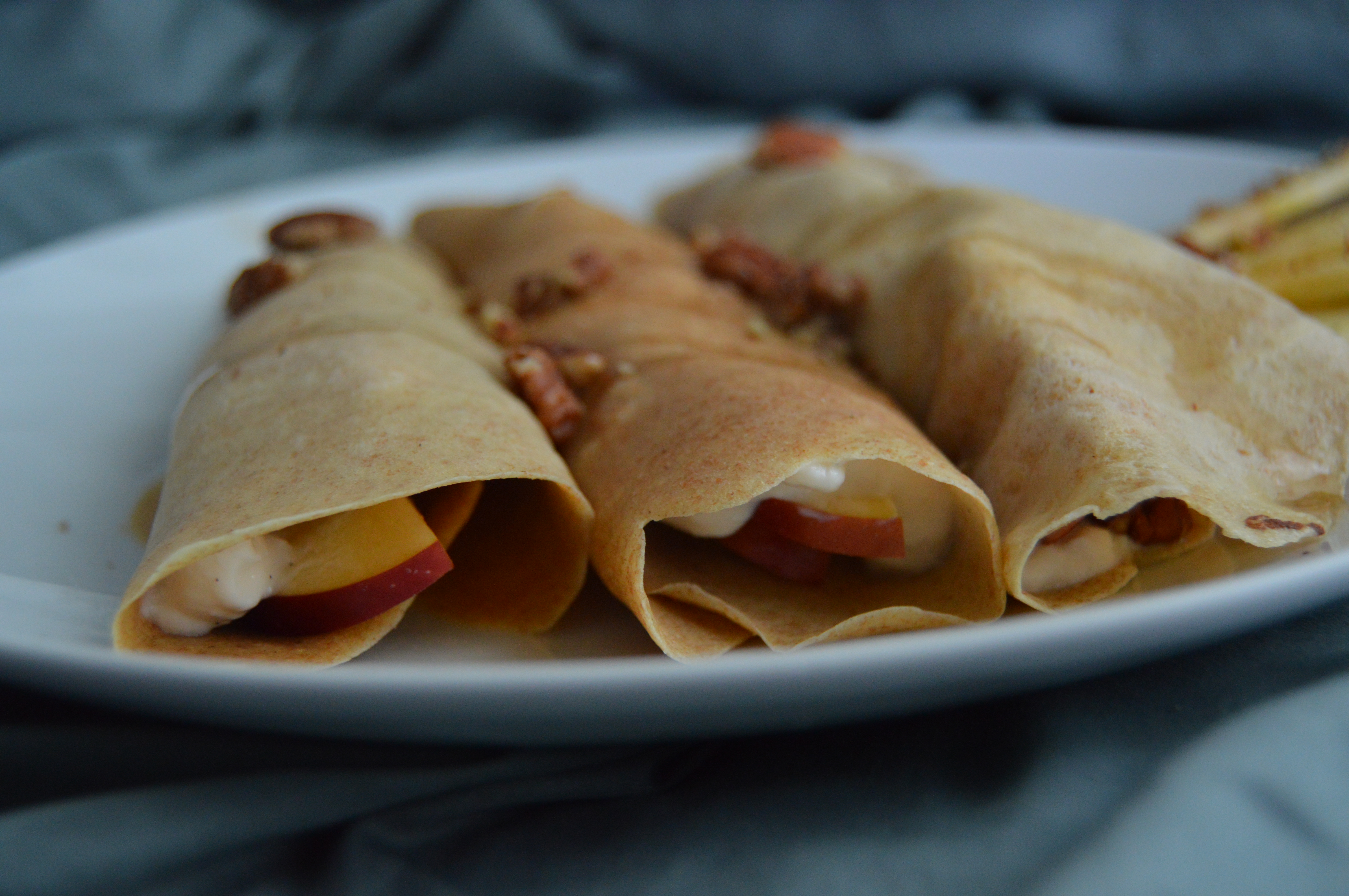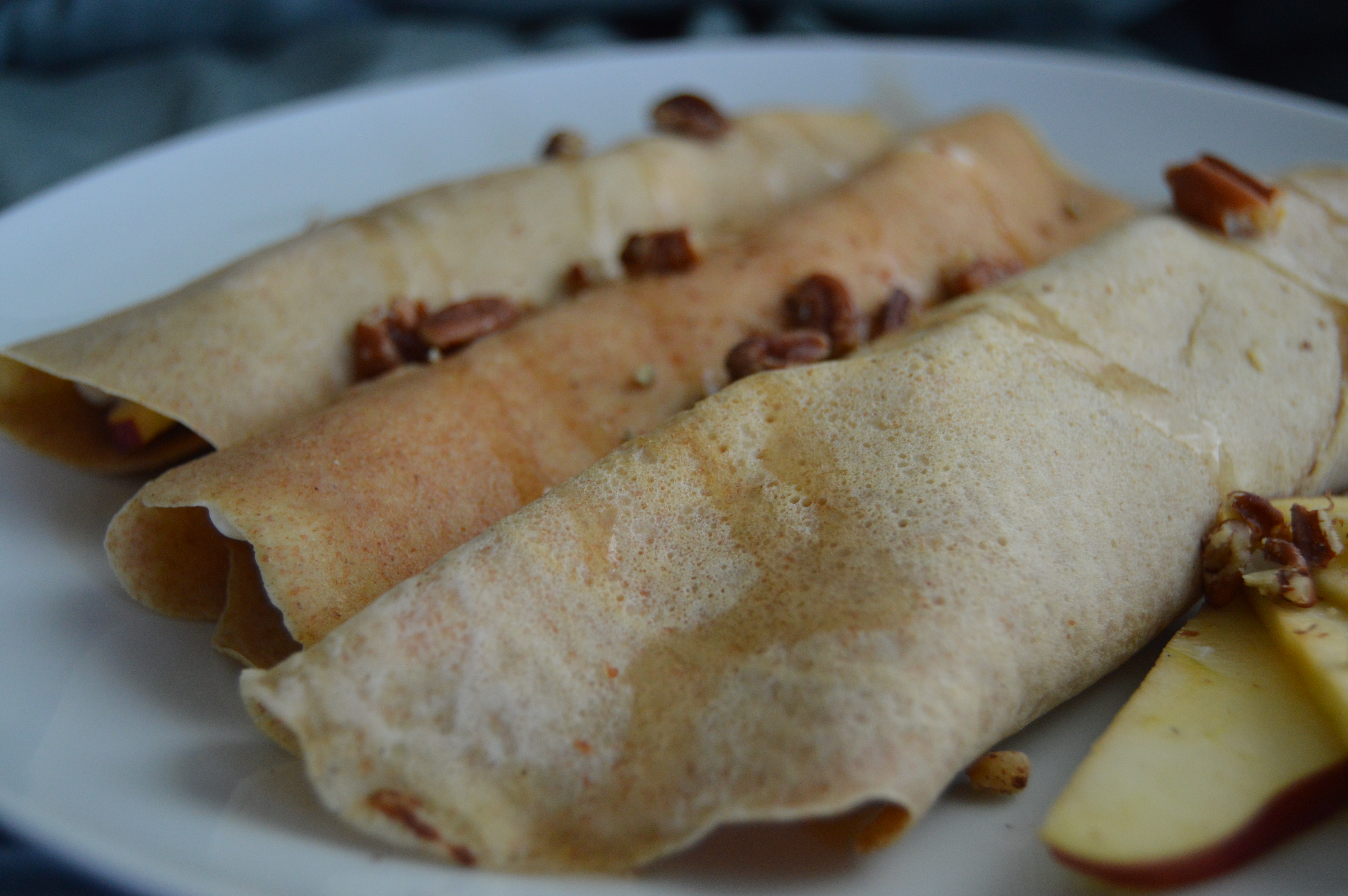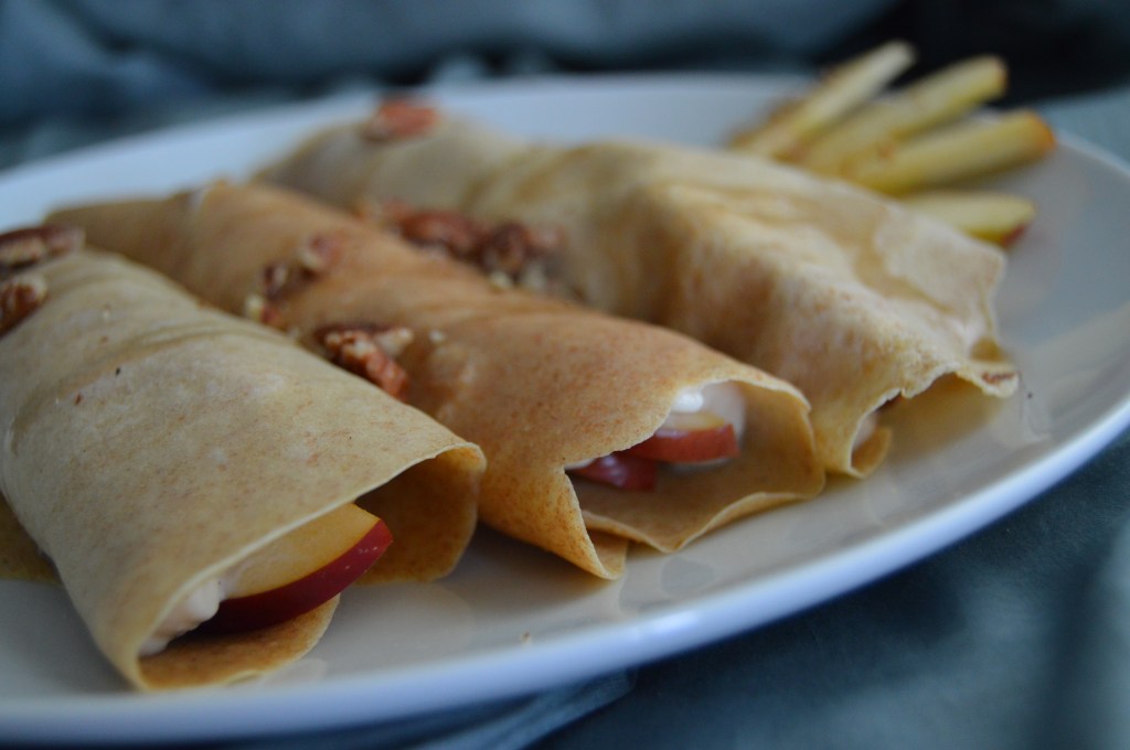 - Fill with greek yogurt, apple slices, and pecans. Roll up then drizzle in a little maple syrup. Perfection! Makes 3-4 crepes