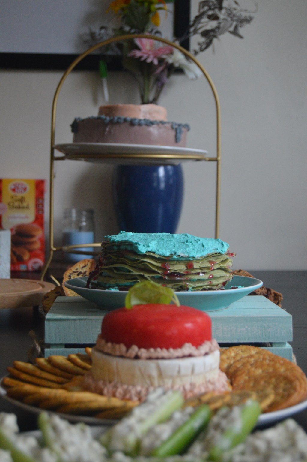 The easiest to make is the cheese cake. You can make this with any of your favorite cheeses but the ones I chose were Edam (with the beautiful red wax shell), a wheel of brie, and colby jack cheese sticks. Basically you are going to make a “cake” out of different cheeses, and decorate using some cream cheese “frosting”