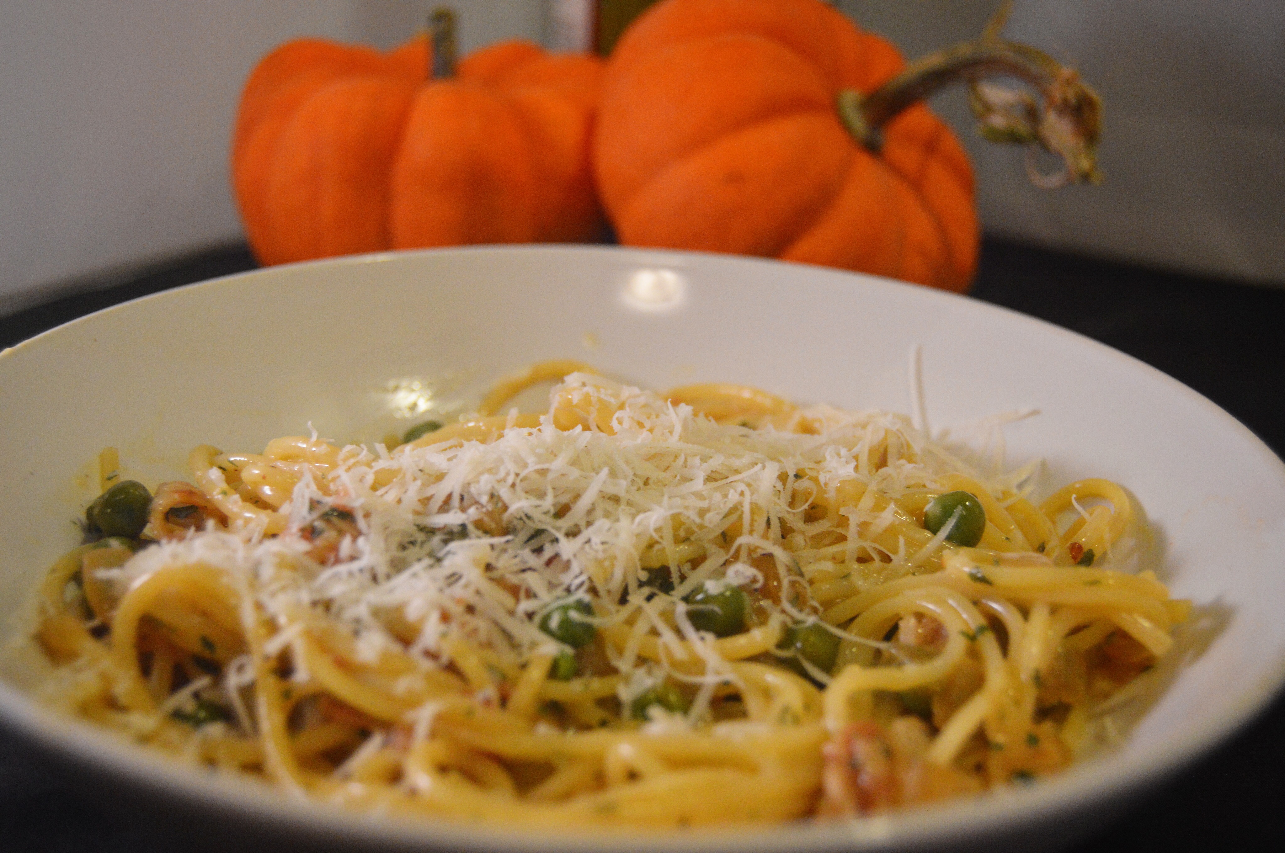 As you saw from my previous post I made a delicious Italian meringue buttercream, which was awesome but left me with several egg yolks with no purpose. Although a pasta dish isn’t exactly what I wanted after a meal based completely on cake, I couldn’t let the opportunity to try this classic pasta dish pass me by. This was definitely different then I expected when making this, but it was delicious and surprisingly simple. I added peas, which isn’t traditional, but having little bits of green made me feel better about a dish full of bacon and pasta. Try this dish when you have extra egg yolks on hand, or if you just want a really delicious meal.