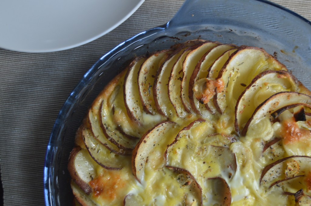 - Begin by slicing the potatoes nice and thin. Begin to layer them in a round pie pan in a circular pattern. Every few slices add in some onion. Until the whole thing looks a bit like a flower. Sprinkle with salt, pepper, and thyme. Add dollops of butter scattered around the pan.